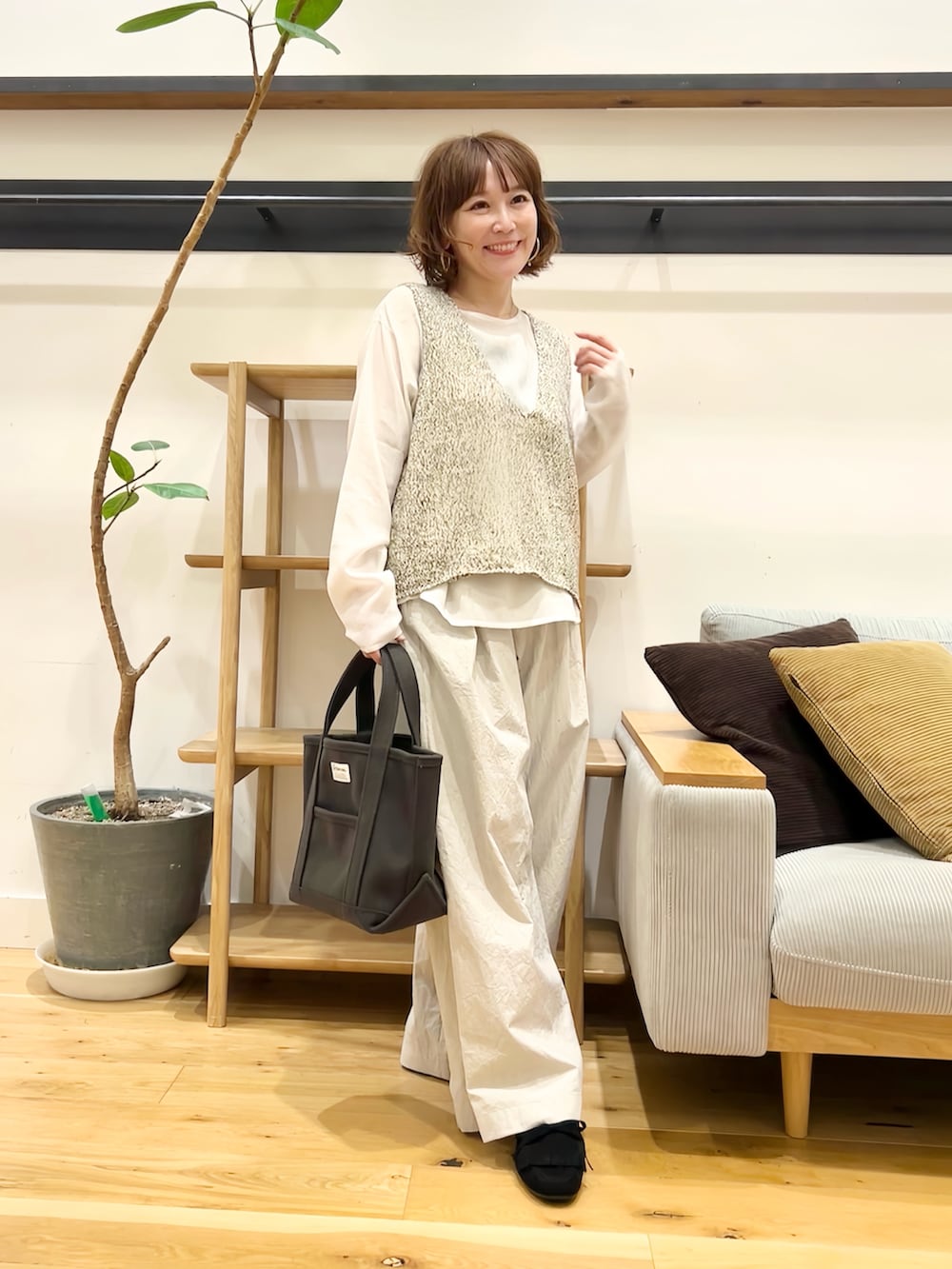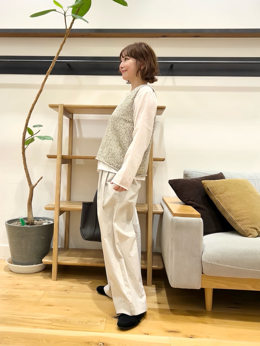 長袖Tやシャツの上にプラスするだけで季節感が出ます。深めのVラインで首元はすっきり!リラックス感がありながらも、だらしなく見えない絶妙な開き具合です。