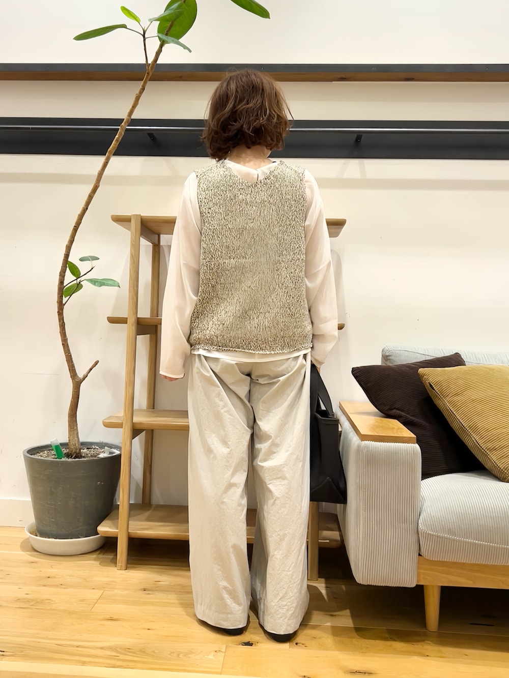 中にキャミソール合わせで熱い時期は一枚で、寒くなってきたらベストやニット、の重ね着のインナーにもとっても使えるアイテムです!