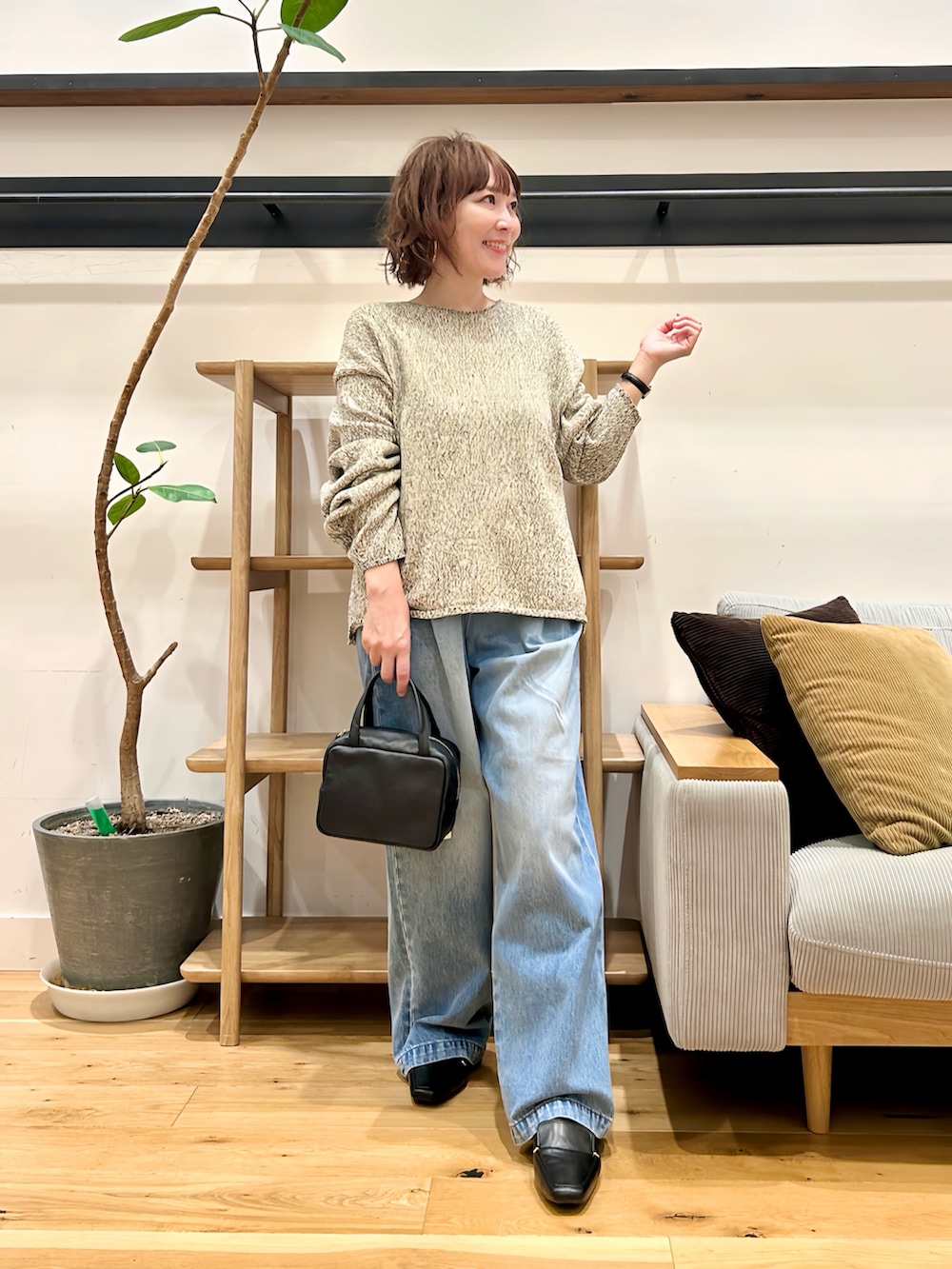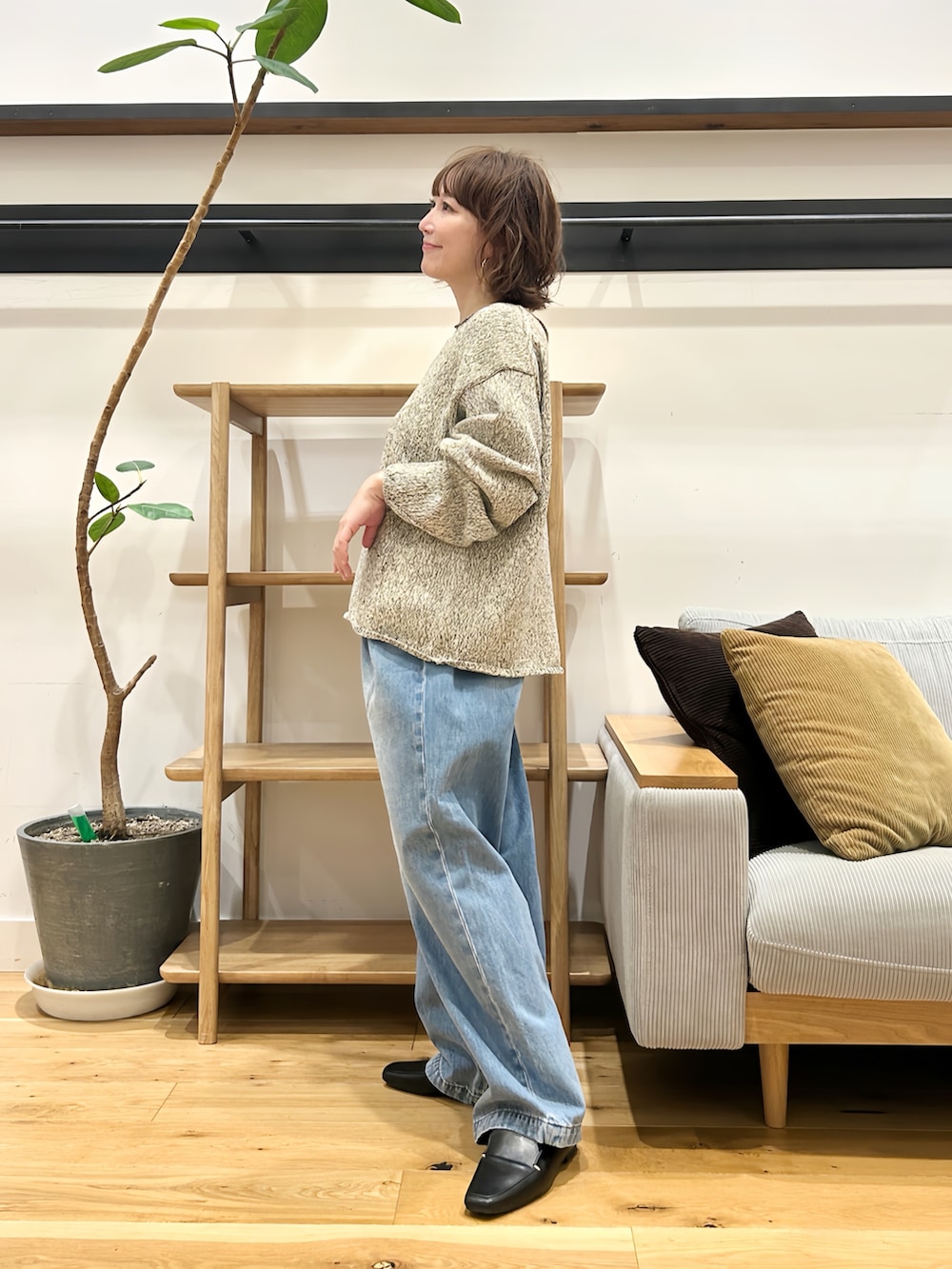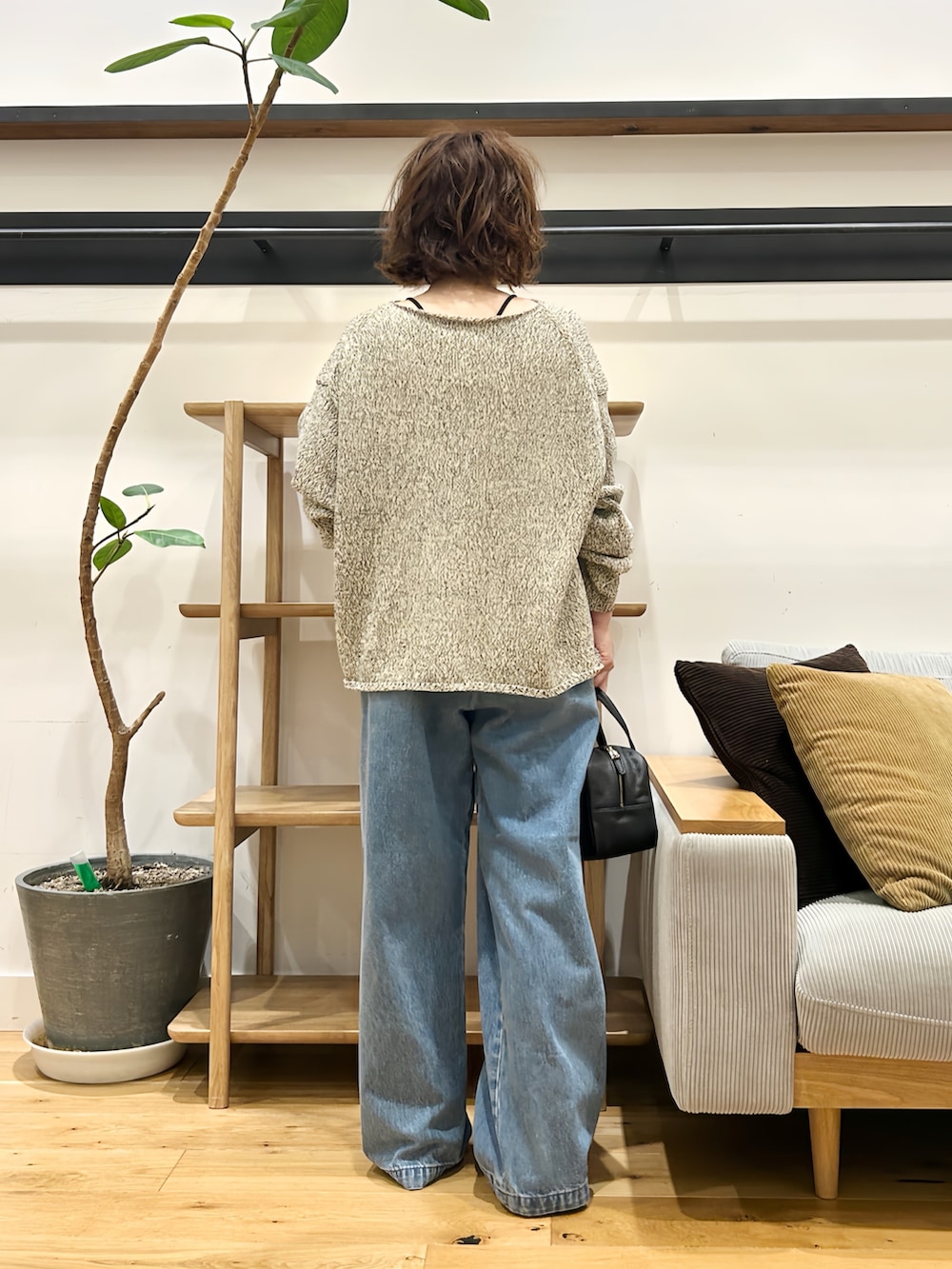 少し広めのボートネックと落ち感のあるシルエットで、ラフに着てもどこか上品な雰囲気。デニムでカジュアルにも、スカートで女性らしくも合わせられます。