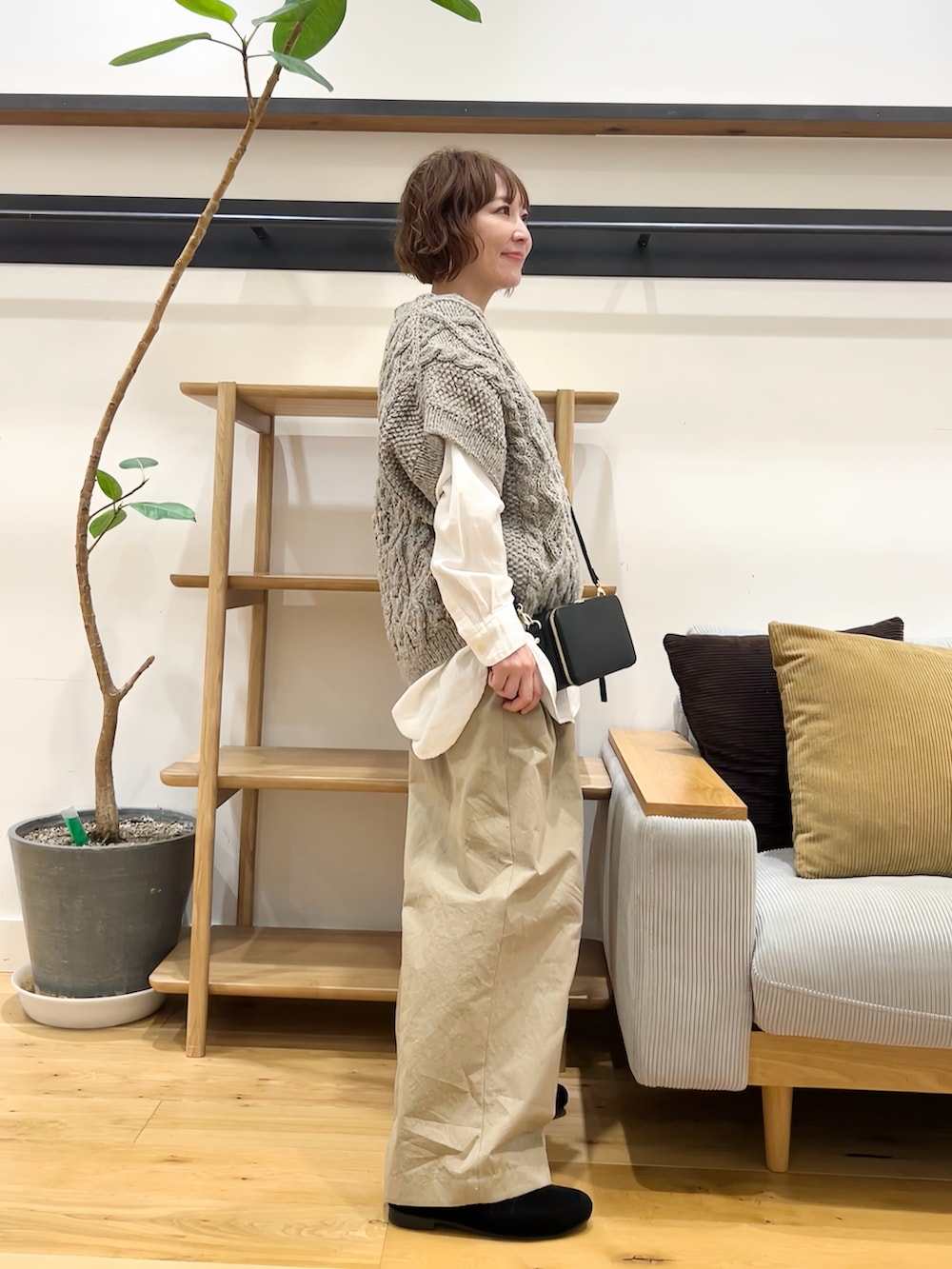 ざっくりとした編み目が程よく存在感を出してくれるので、シンプルなロンTやシャツに重ねるだけで雰囲気のあるスタイリングが完成します。