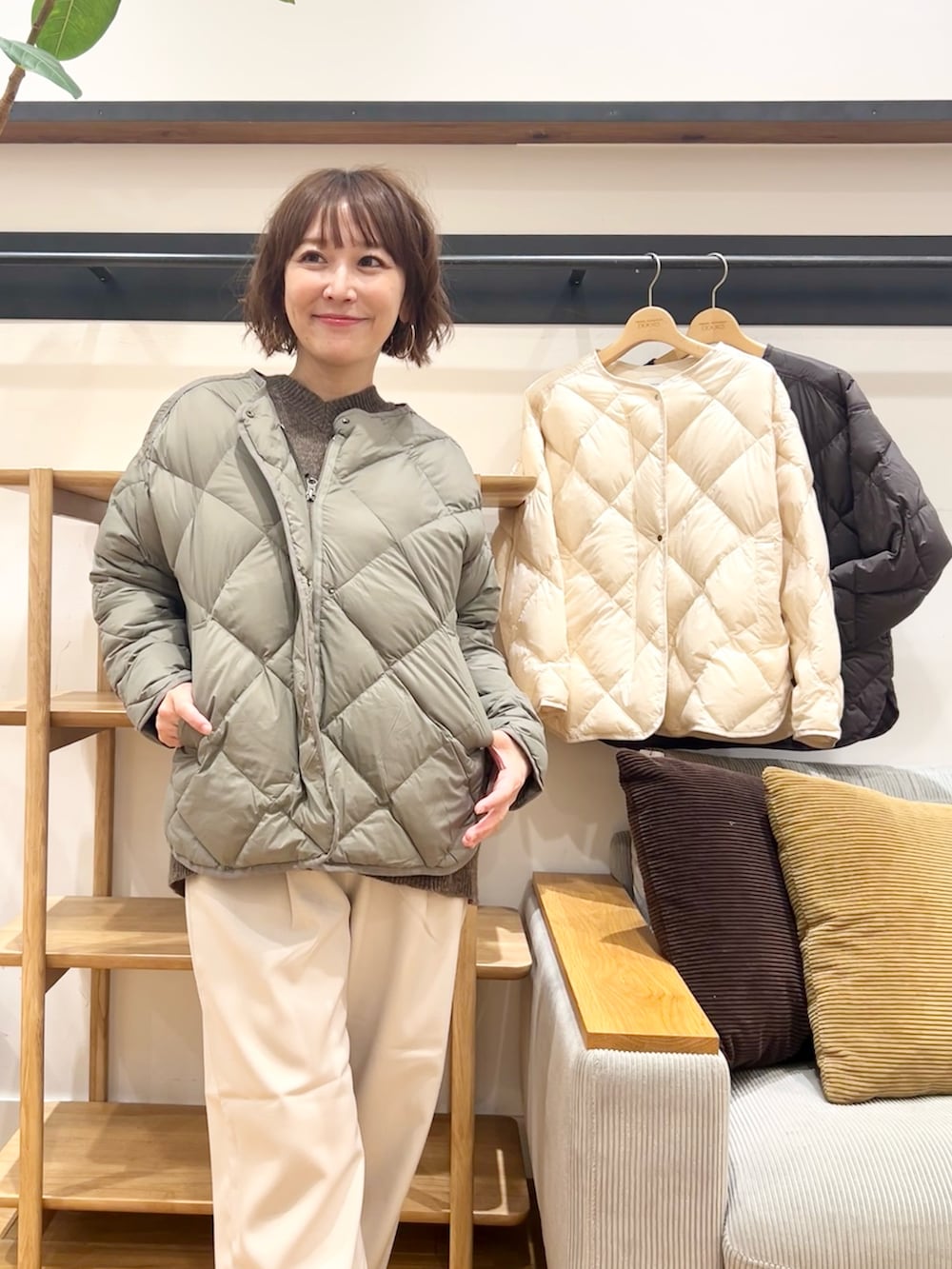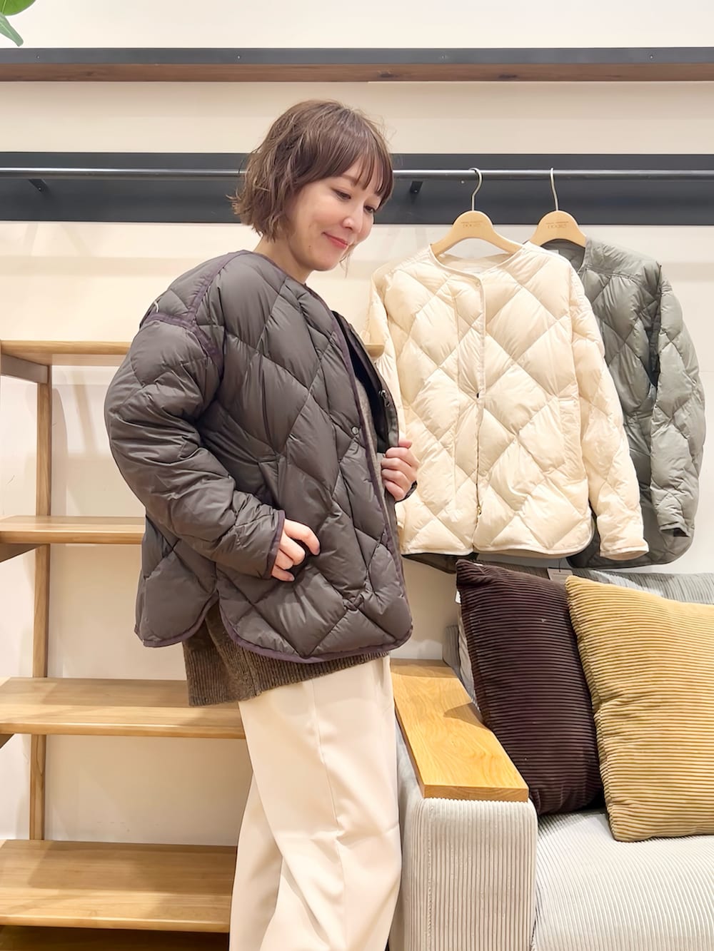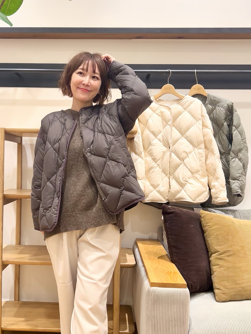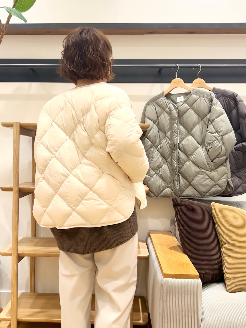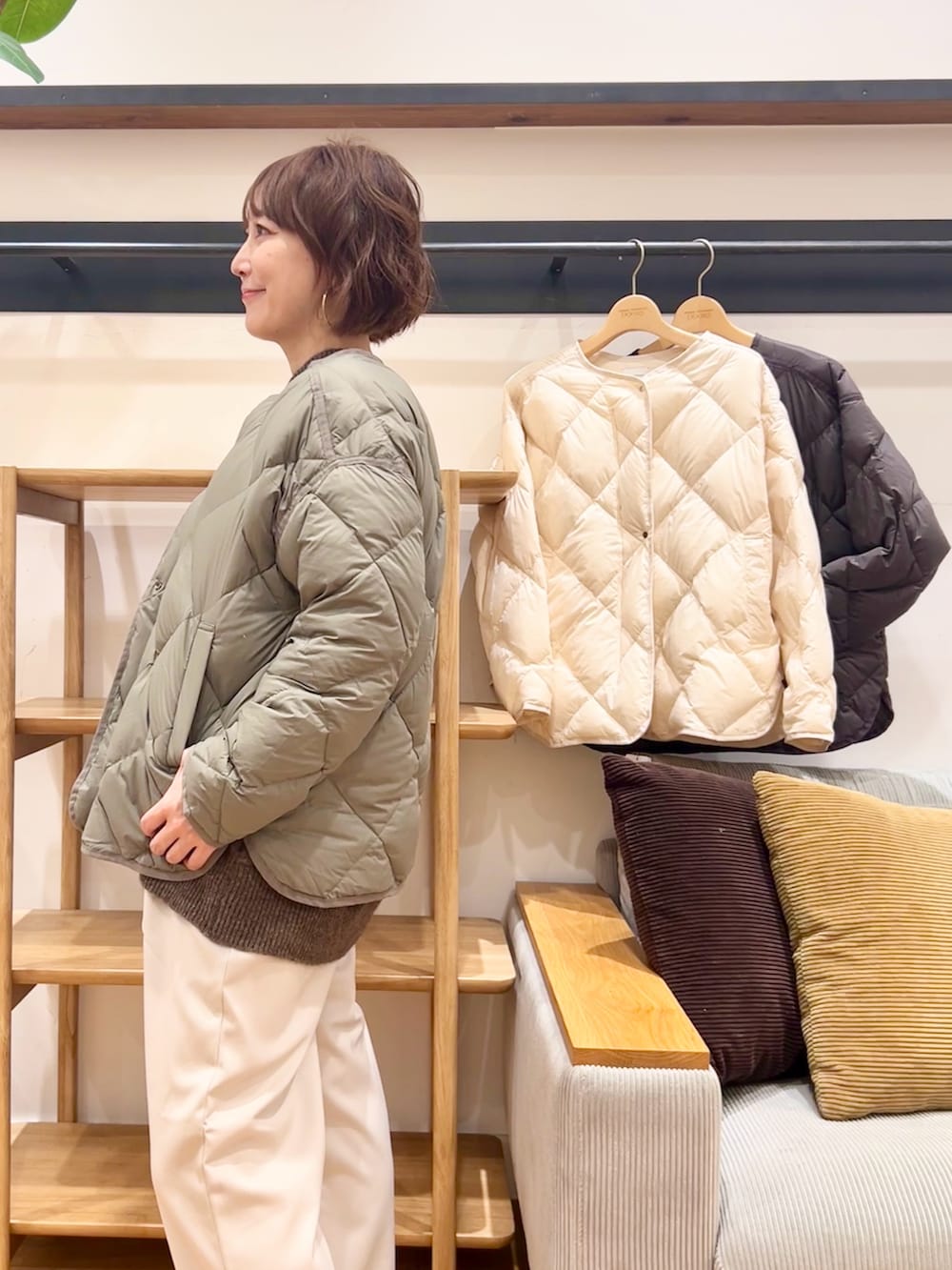 顔まわりが明るく見えるアイボリー、カジュアルな印象のカーキ、大人っぽく合わせやすいチャコールは店頭でも。
