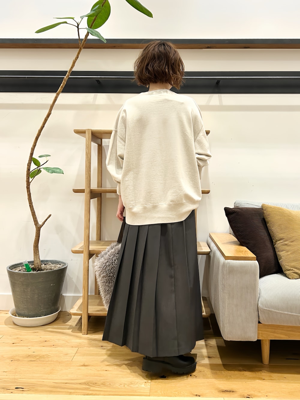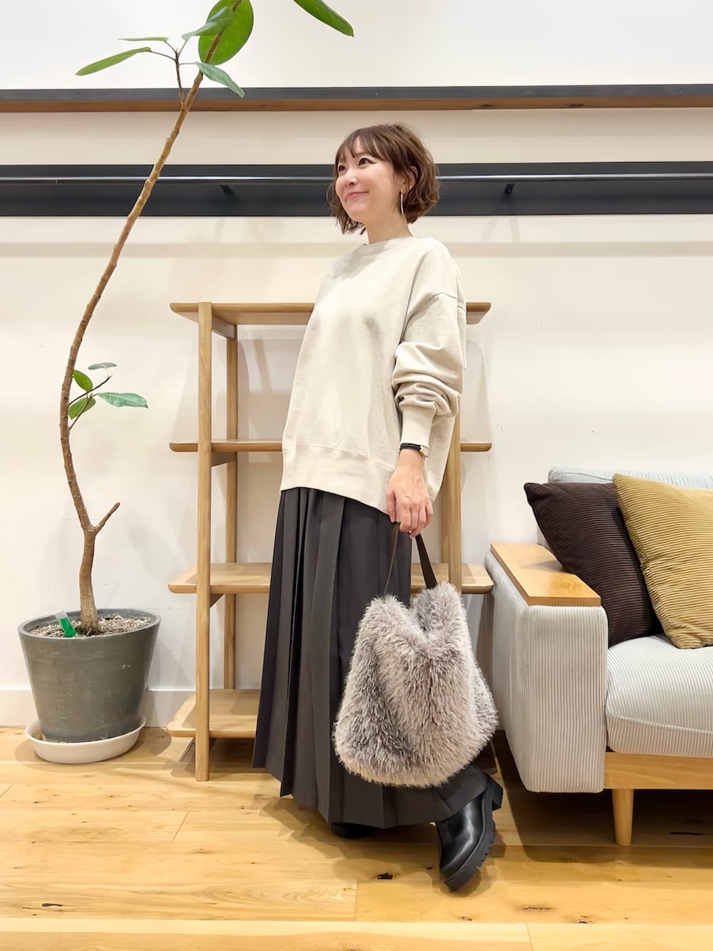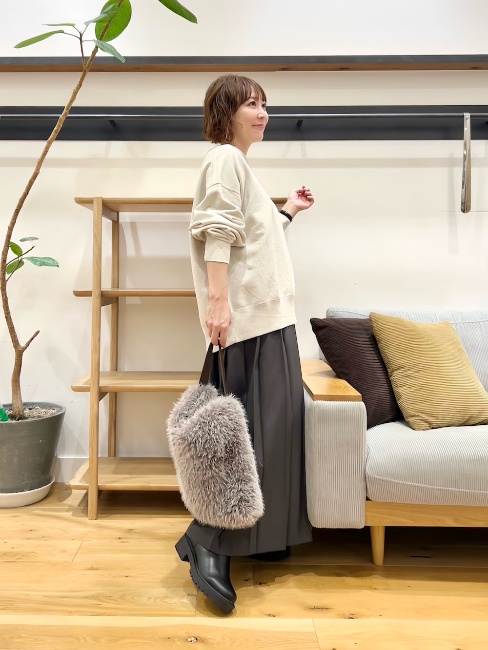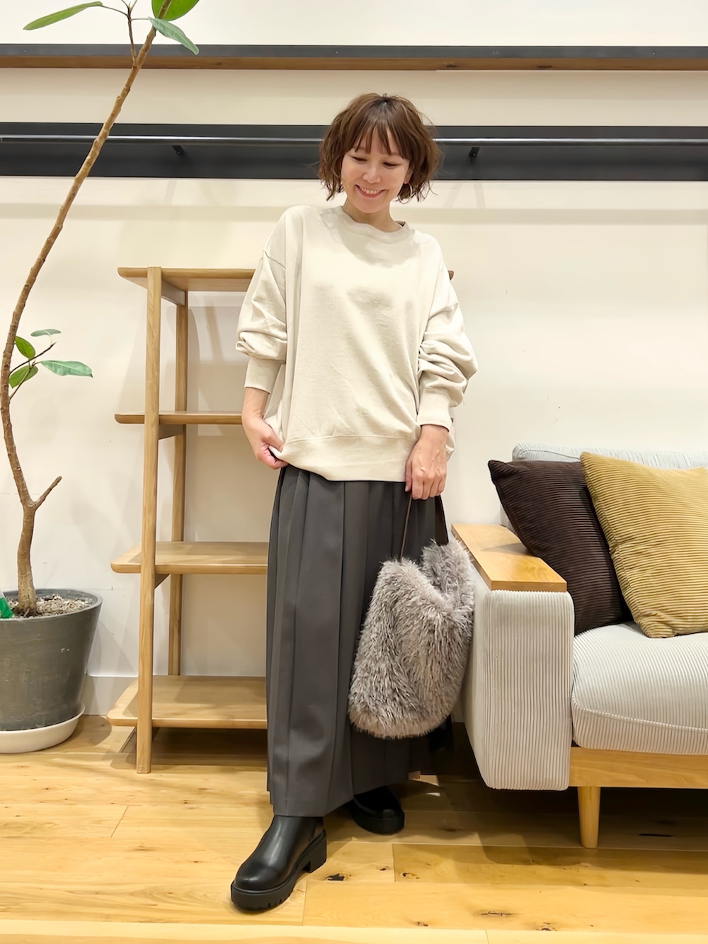 肩の落ちたシルエットが自然な抜け感を演出し、パンツにもスカートにも好相性。