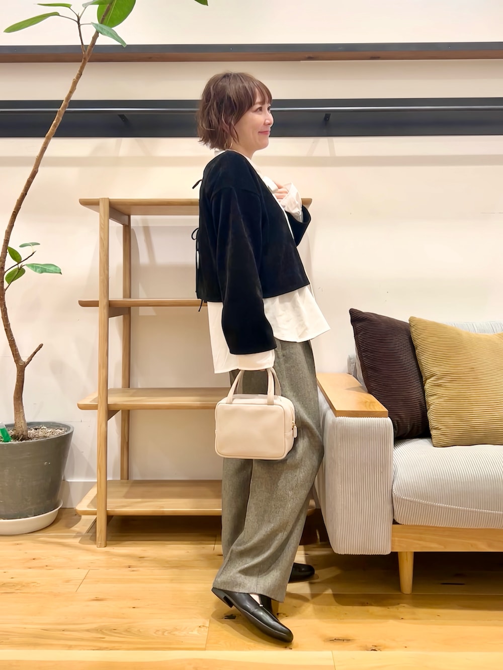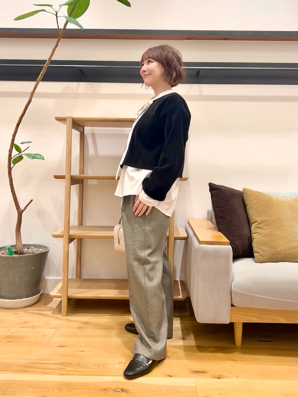 ショート丈なのでハイウエストのパンツやスカートとも相性抜群です。