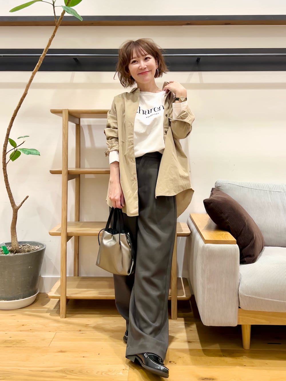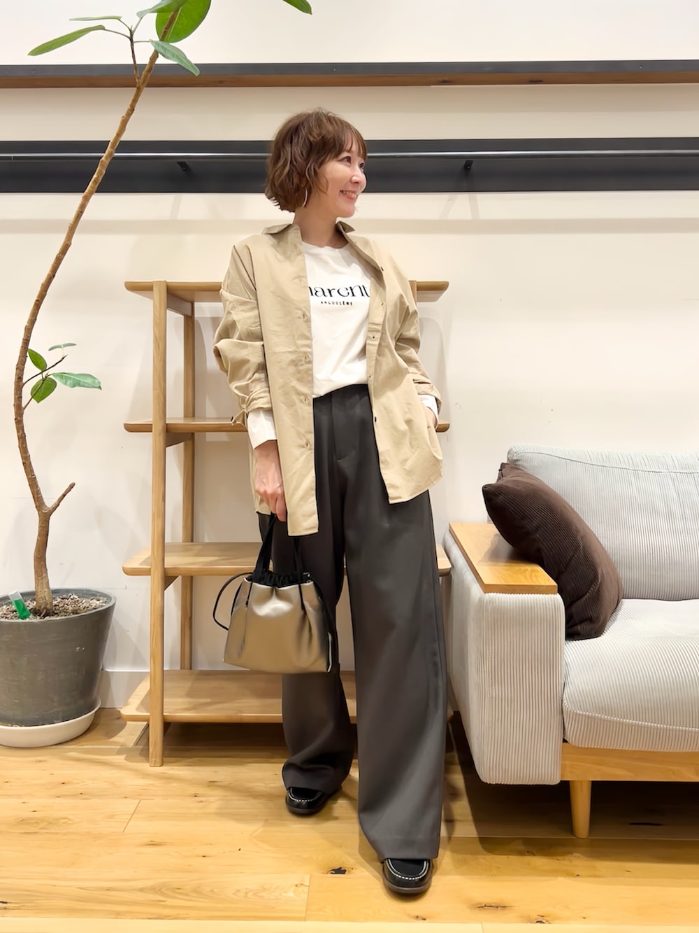 ベージュは肌なじみがよく、さまざまなボトムスと相性も抜群です。