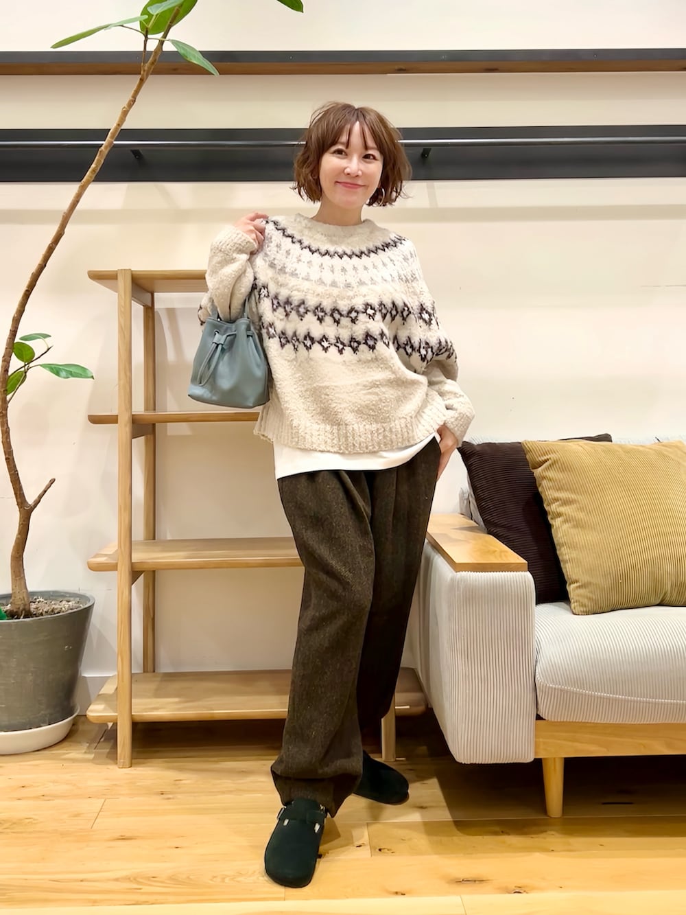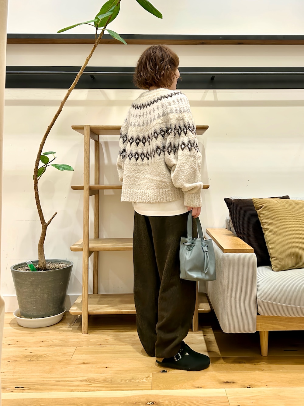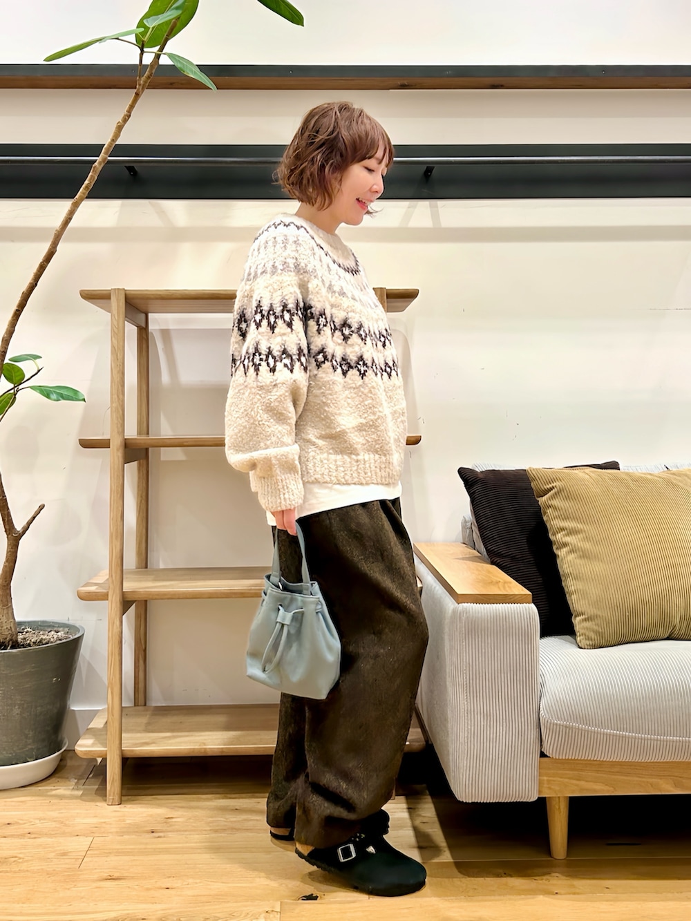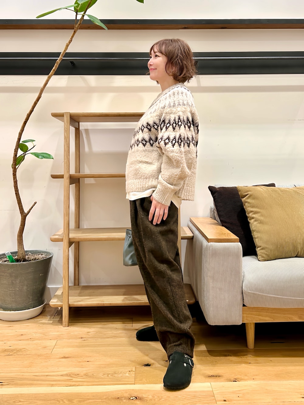 柄は落ち着いたトーンなので派手になりすぎず、いつものパンツやスカートに合わせるだけで一気に冬らしい雰囲気になります!