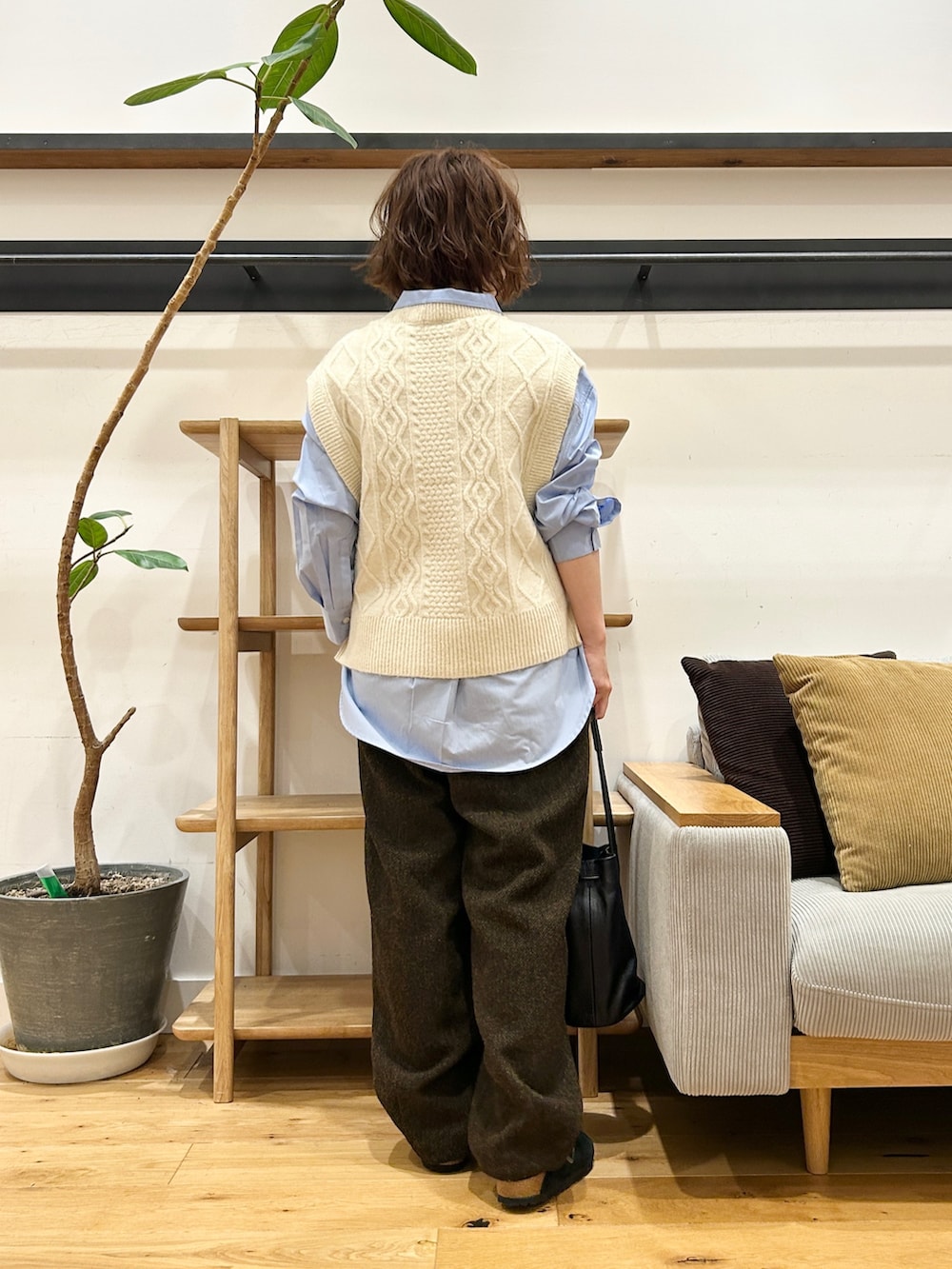 表面に立体感があるケーブル編みなので、いつもの服に重ねるだけで季節感をプラスできます♪