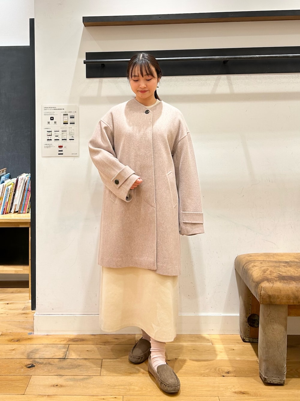 裏地がないので着膨れせずノーカラーで首まわりがすっきりしているので、マフラーやストール、タートルを合わせても可愛いです◎