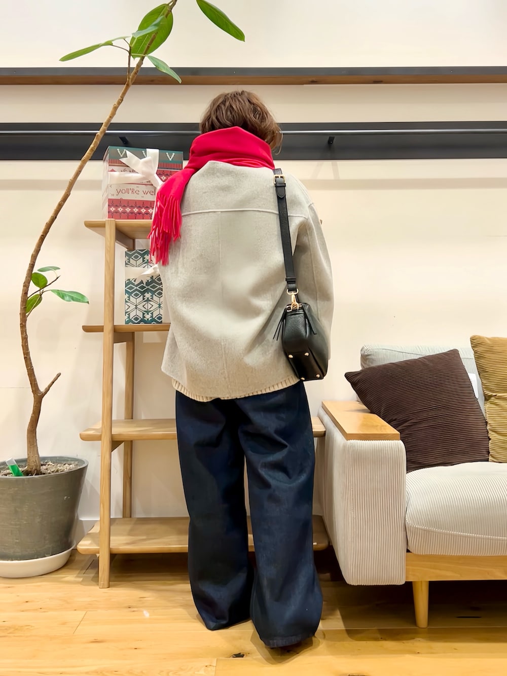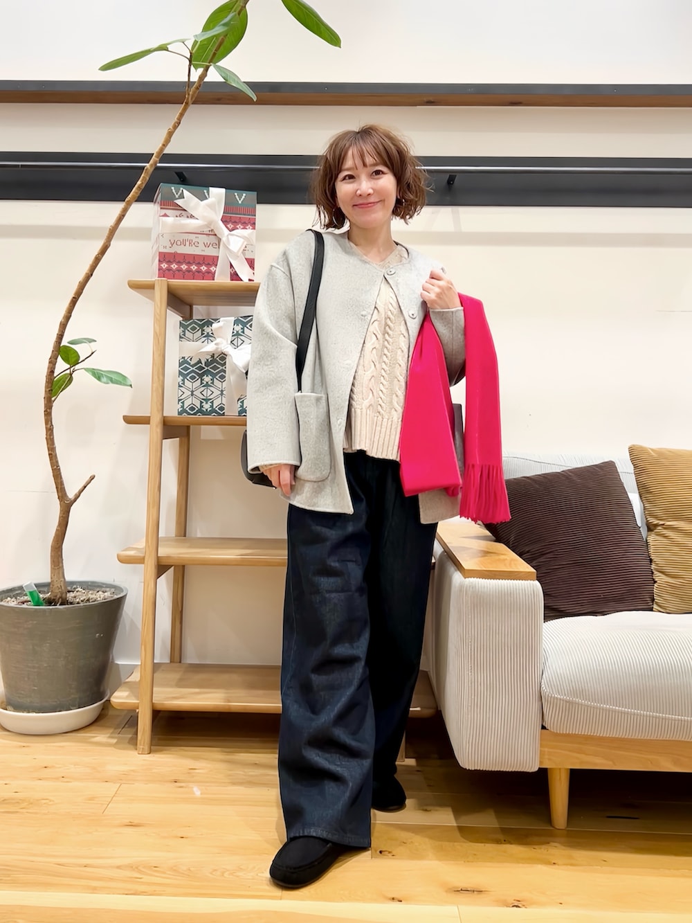 生地が軽いのにちゃんと暖かくて、肩まわりに程よいゆとりがあるので、中に着こんでもゴワつきません。気になる腰まわりも自然とカバーしてくれて、丸みのあるシルエットが女性らしく見せてくれます。