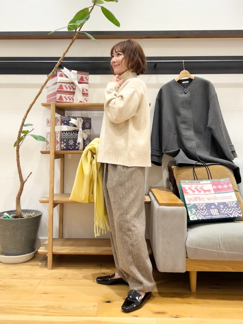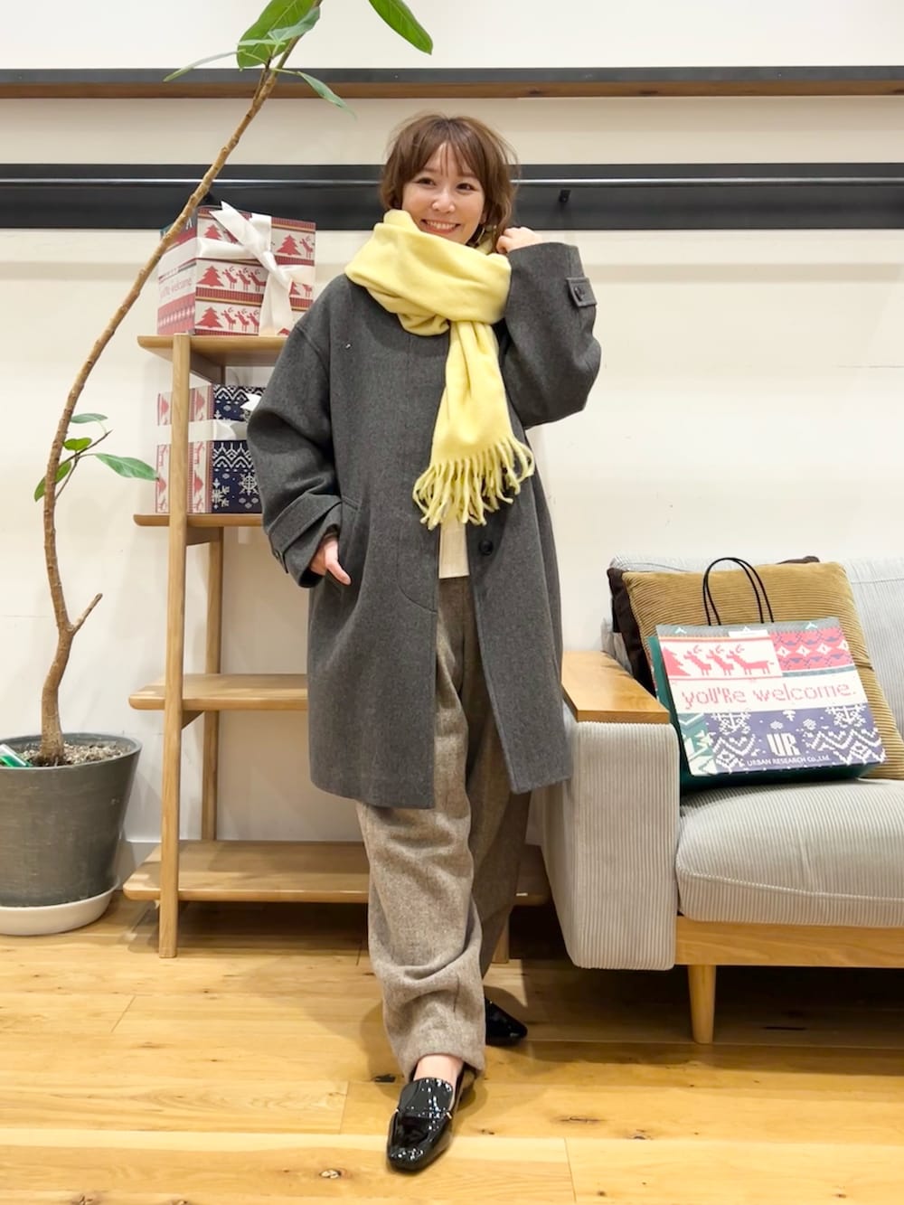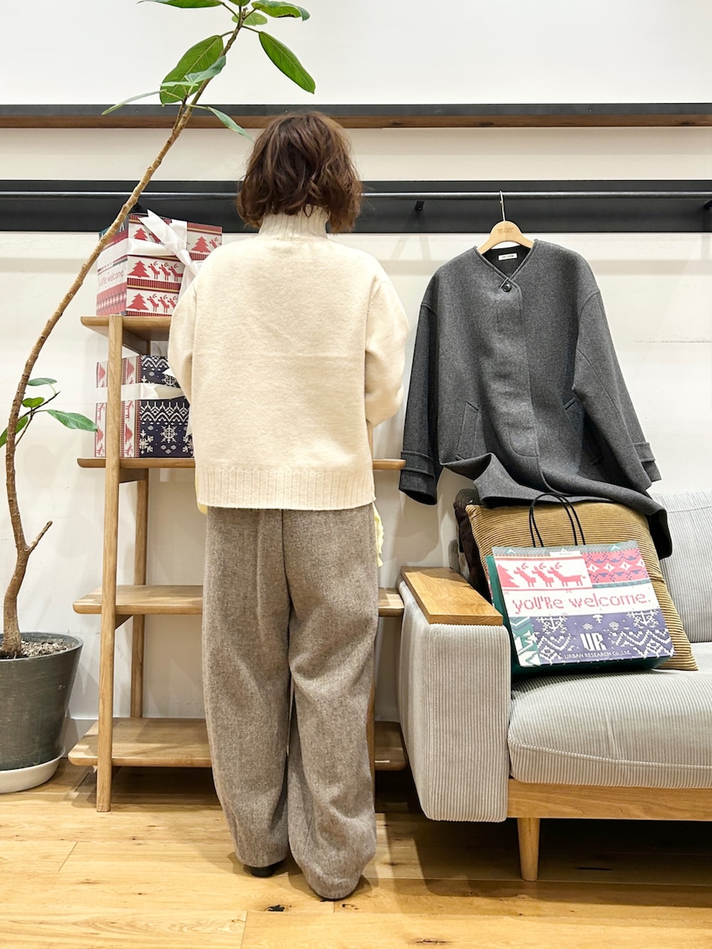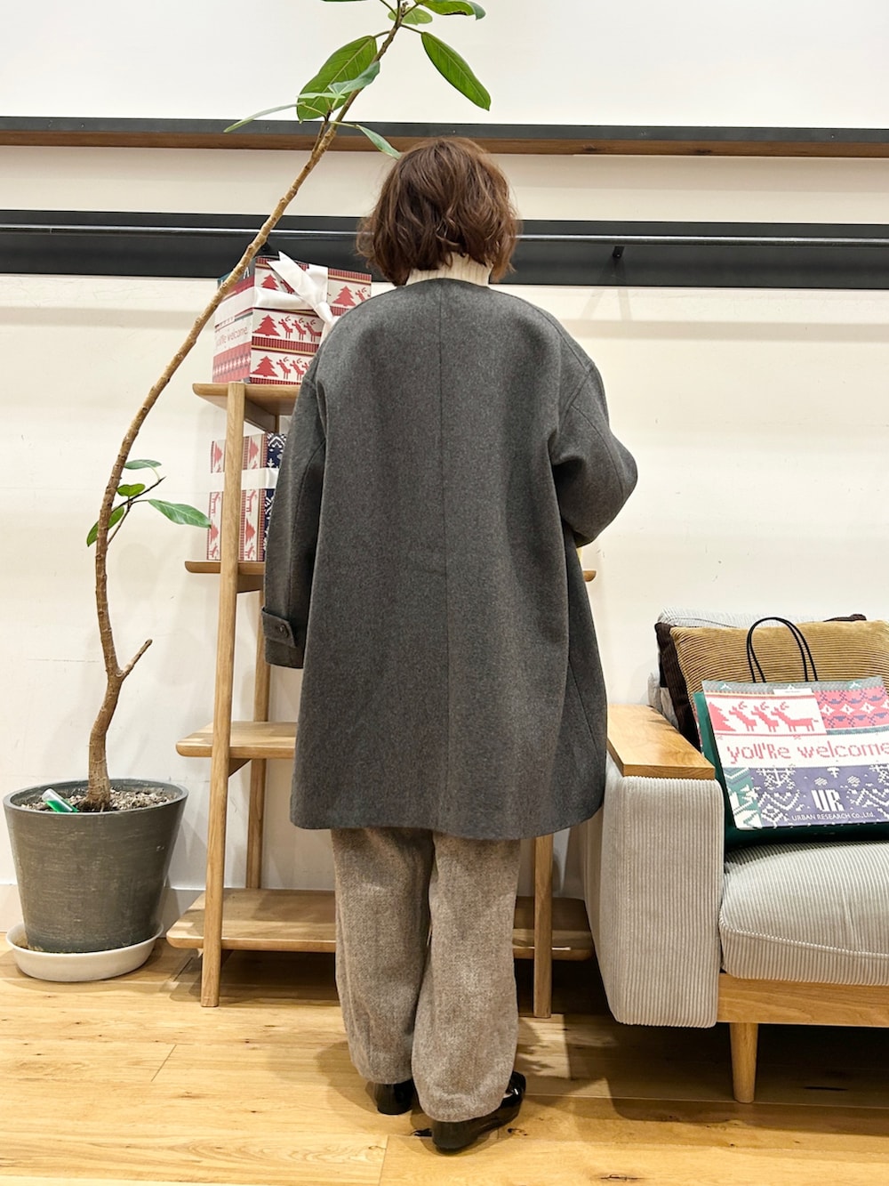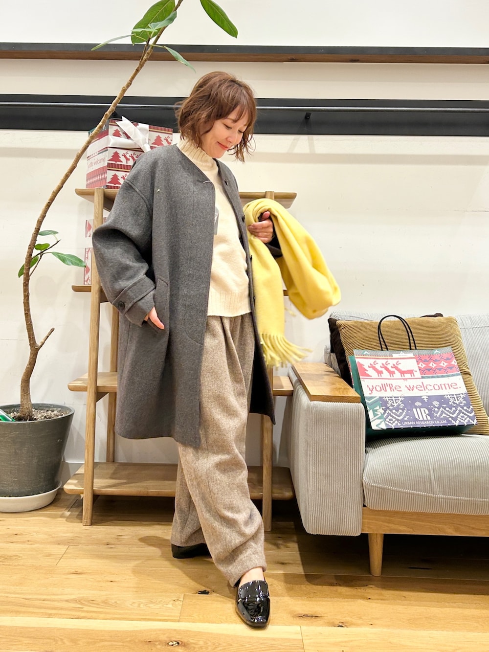 ノーカラーで首まわりがすっきりしているので、マフラーやストール、タートルを合わせても可愛いです◎