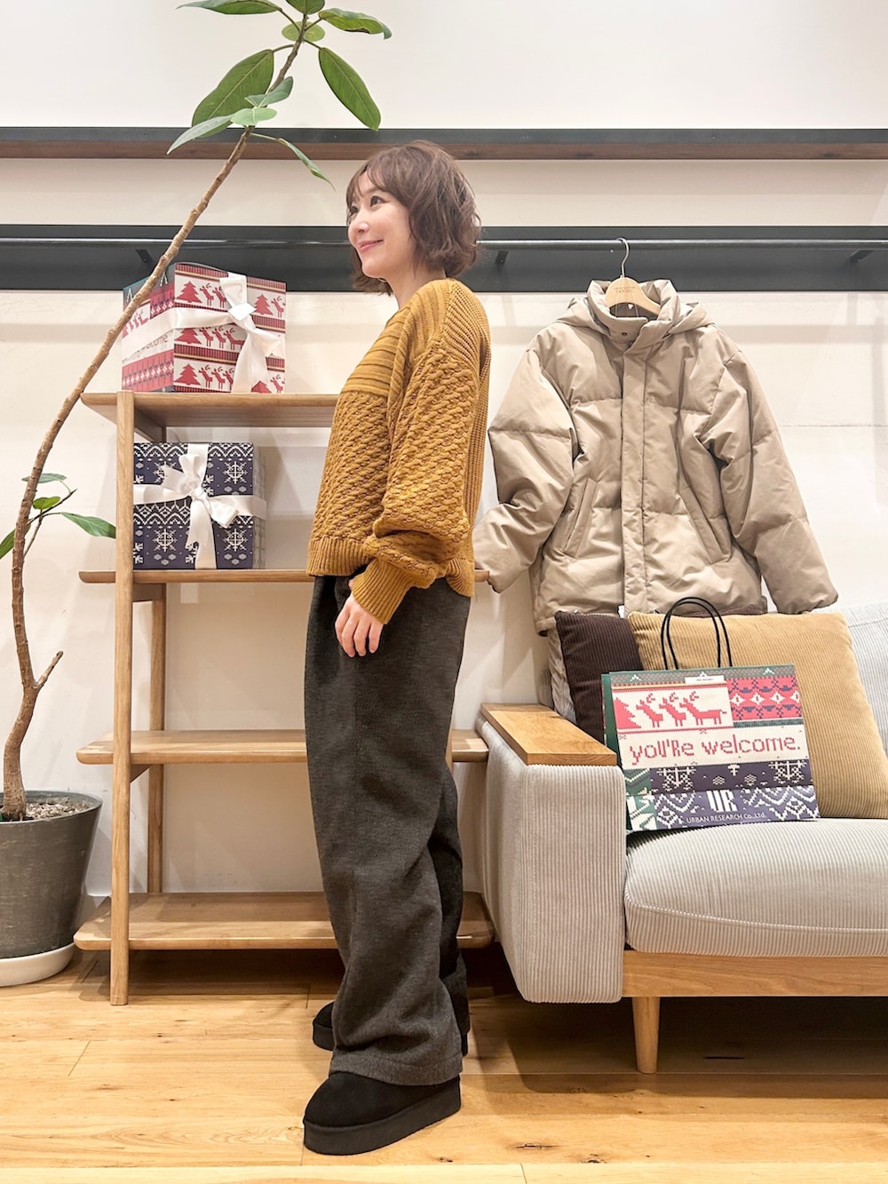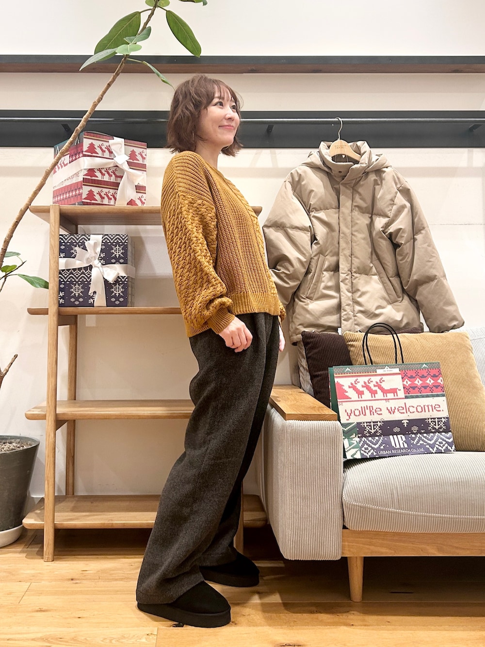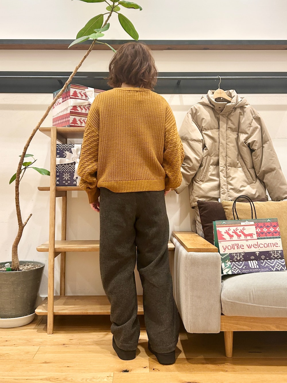 編み地を切り替えたデザインがポイントのニットで、シンプルに着るだけでもコーデがのっぺり見えません。程よい厚みで軽く、インナーを入れてもゴワつかないので今の時期から春先まで活躍します。パンツ・スカートどちらも合わせやすく、普段使いしやすい一枚です。