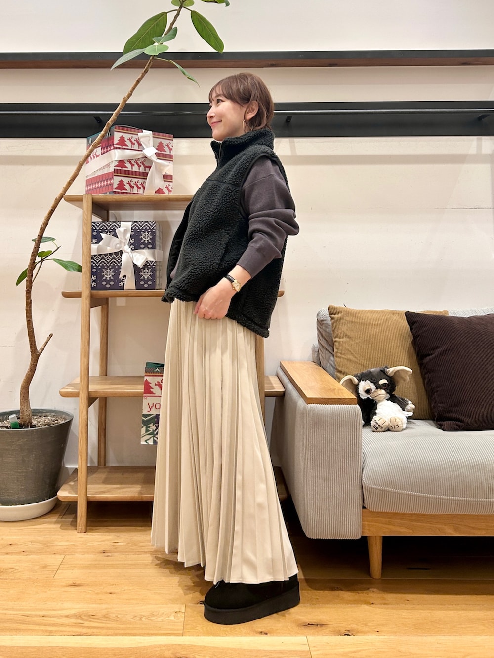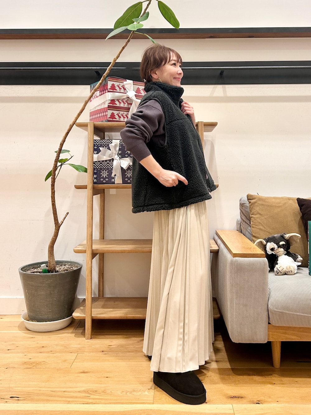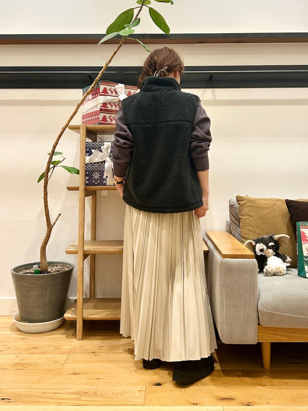 ウールライクなツイル素材、細かくきれいに入ったプリーツが動くたびに揺れて、ニットやスウェットなどボリュームのあるトップスと合わせてもバランスよく着ていただけます♪