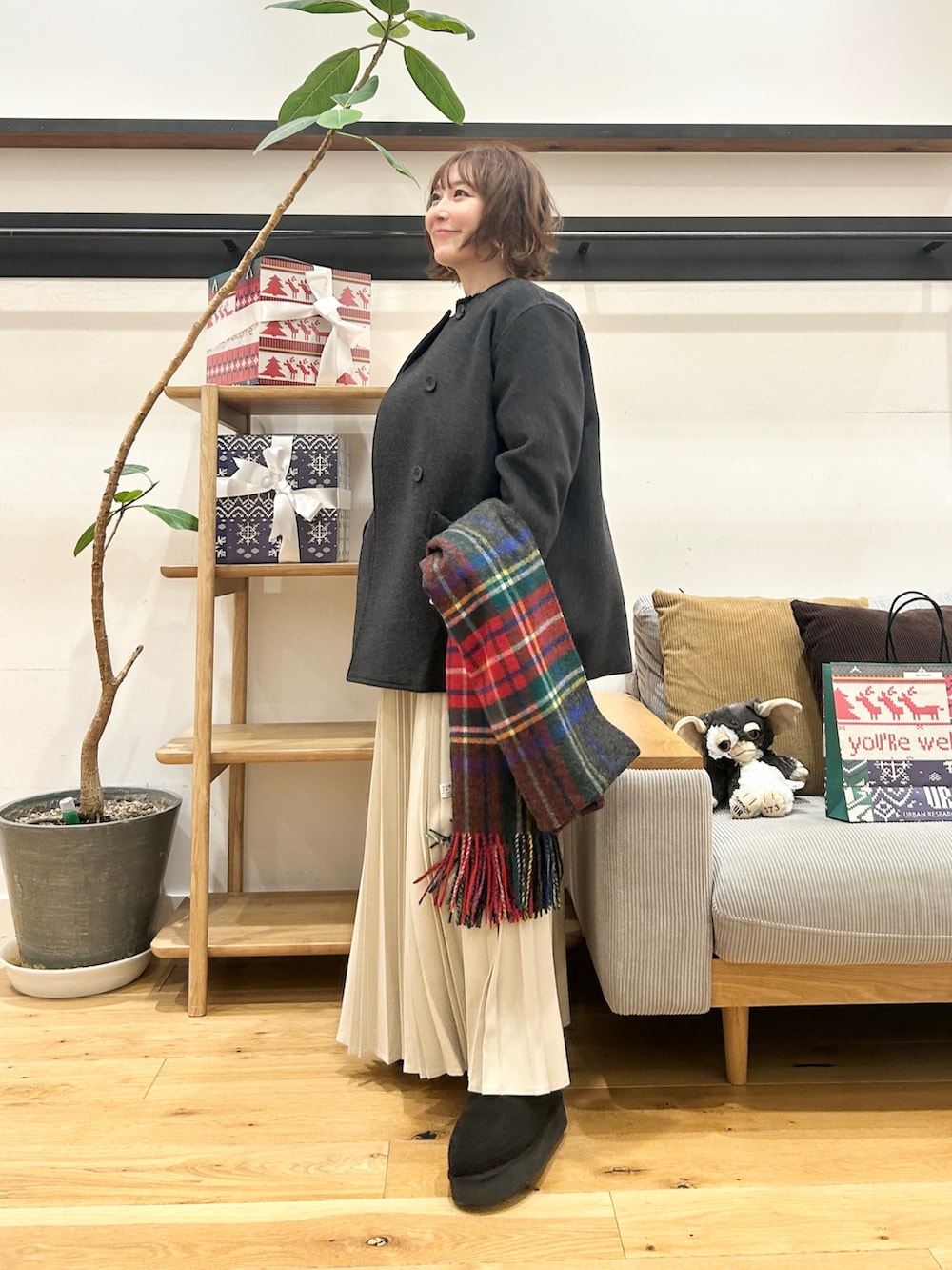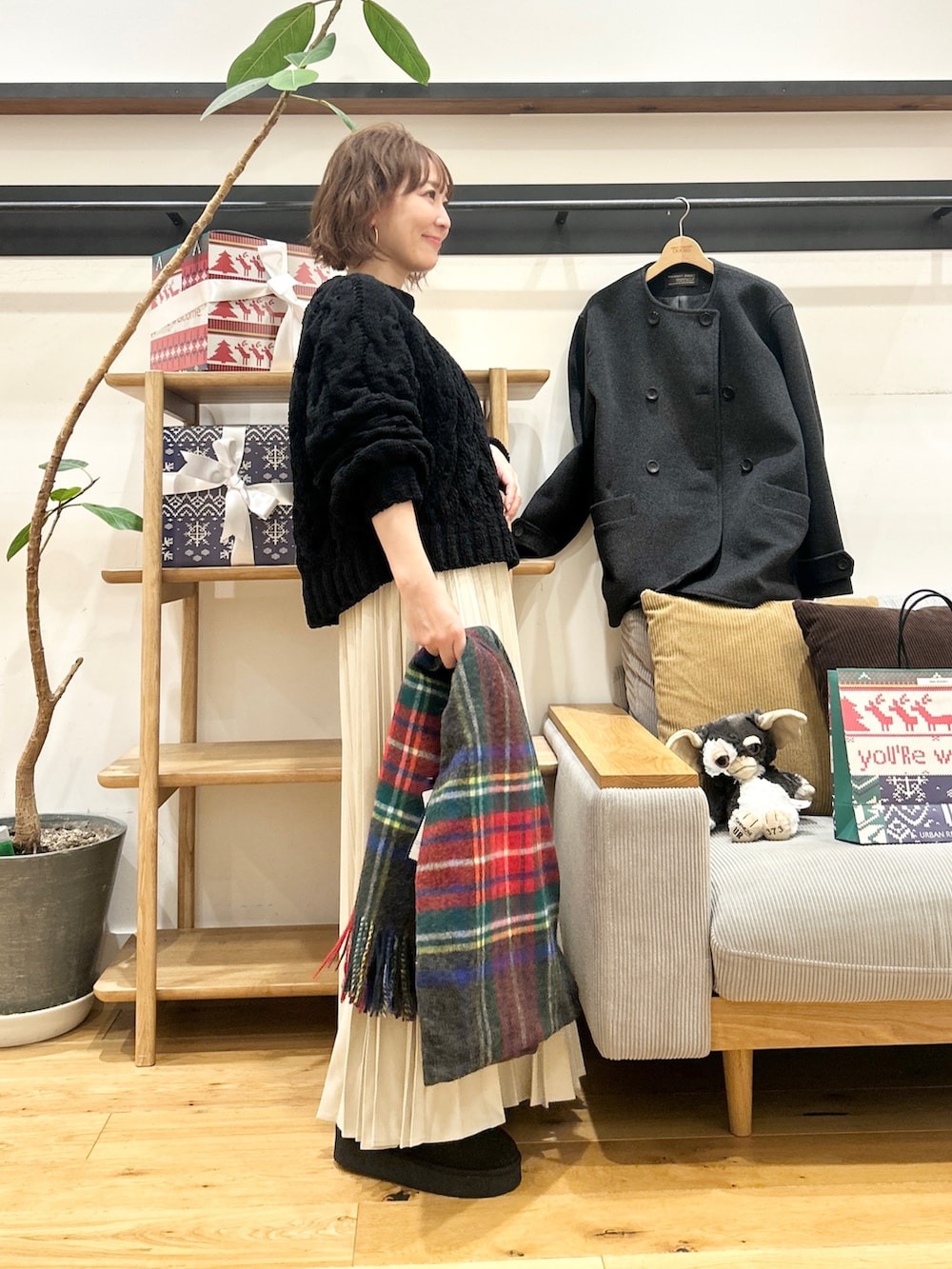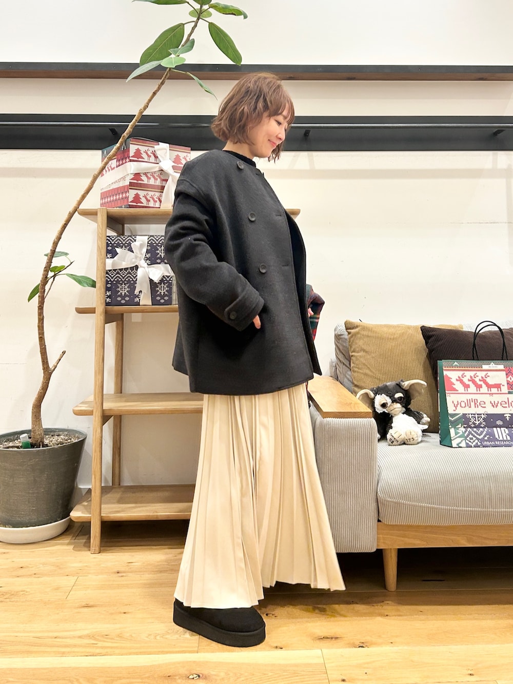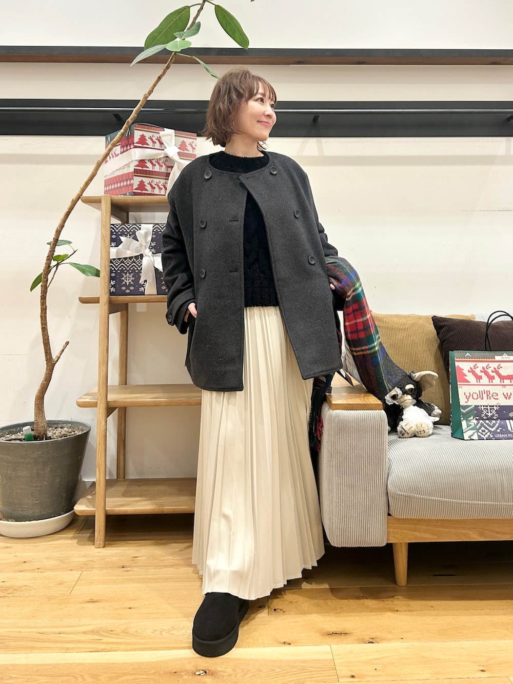 サイズ感は大きすぎず、パンツでもスカートでも合わせやすいのがポイントです。