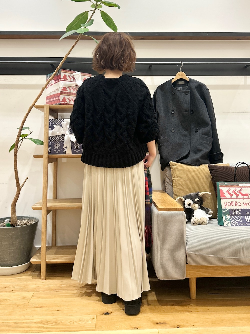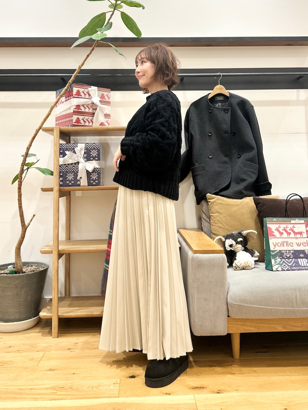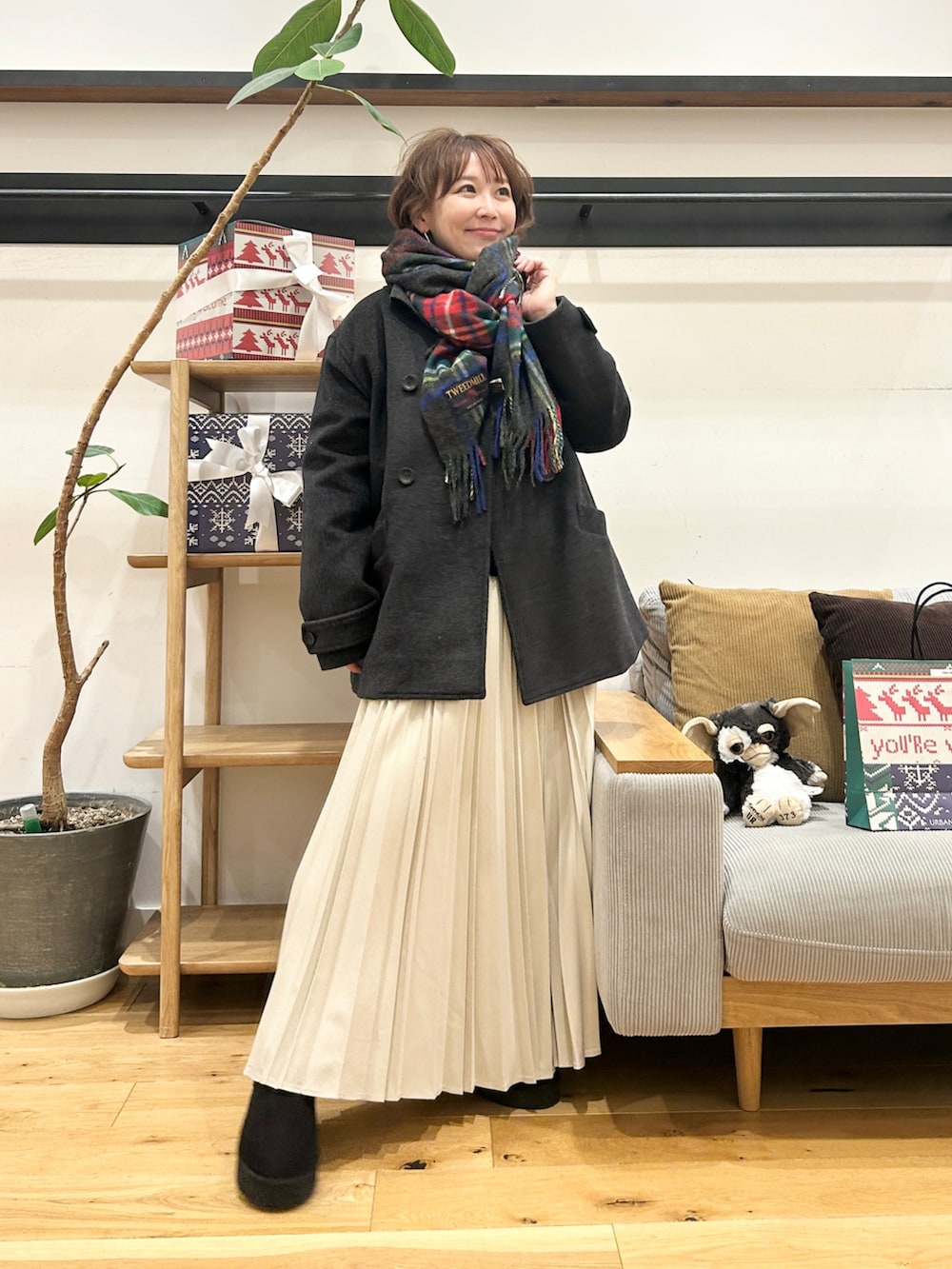 ウールライクなツイル素材、細かくきれいに入ったプリーツが動くたびに揺れて、ニットやスウェットなどボリュームのあるトップスと合わせてもバランスよく着ていただけます♪