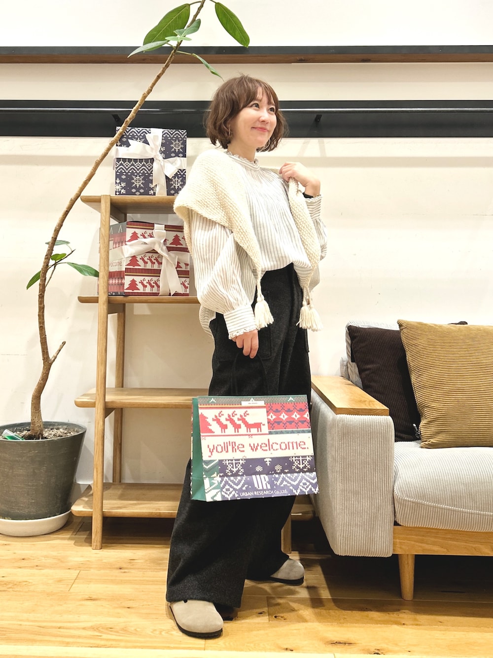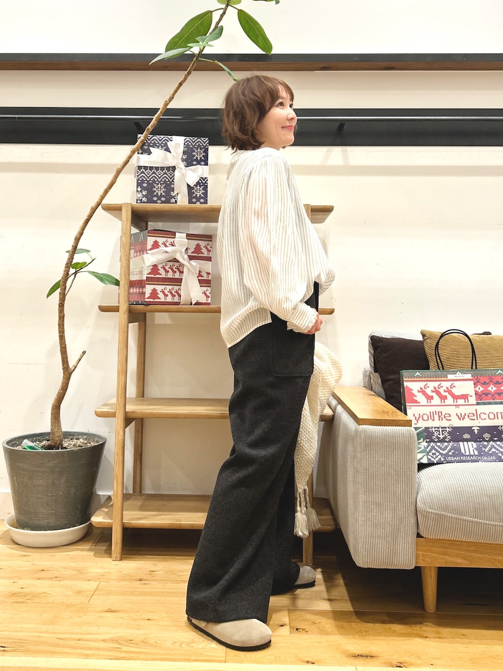 ややハイウエスト+後ろゴム仕様で、きちんと見えしつつもリラックス感もあり。