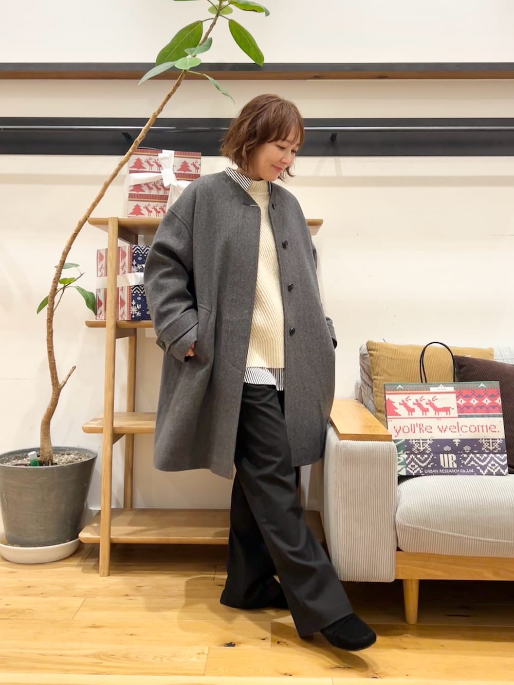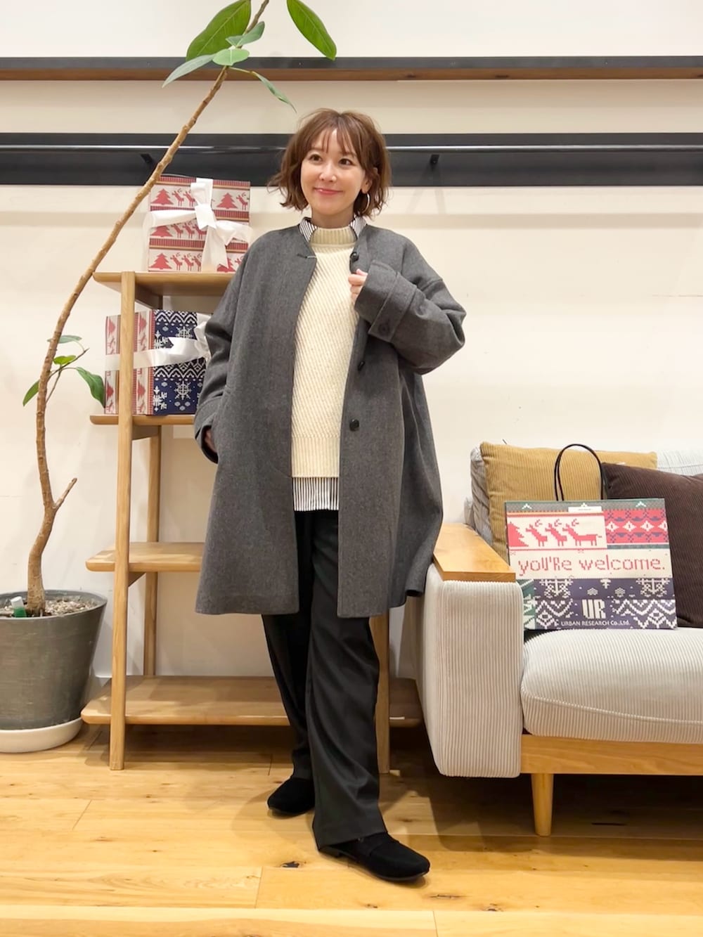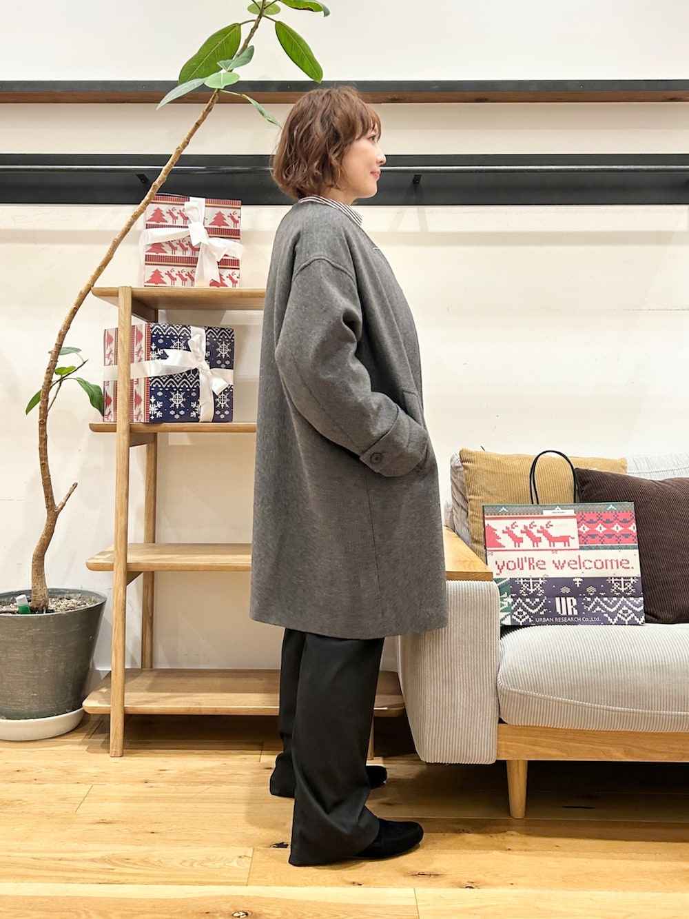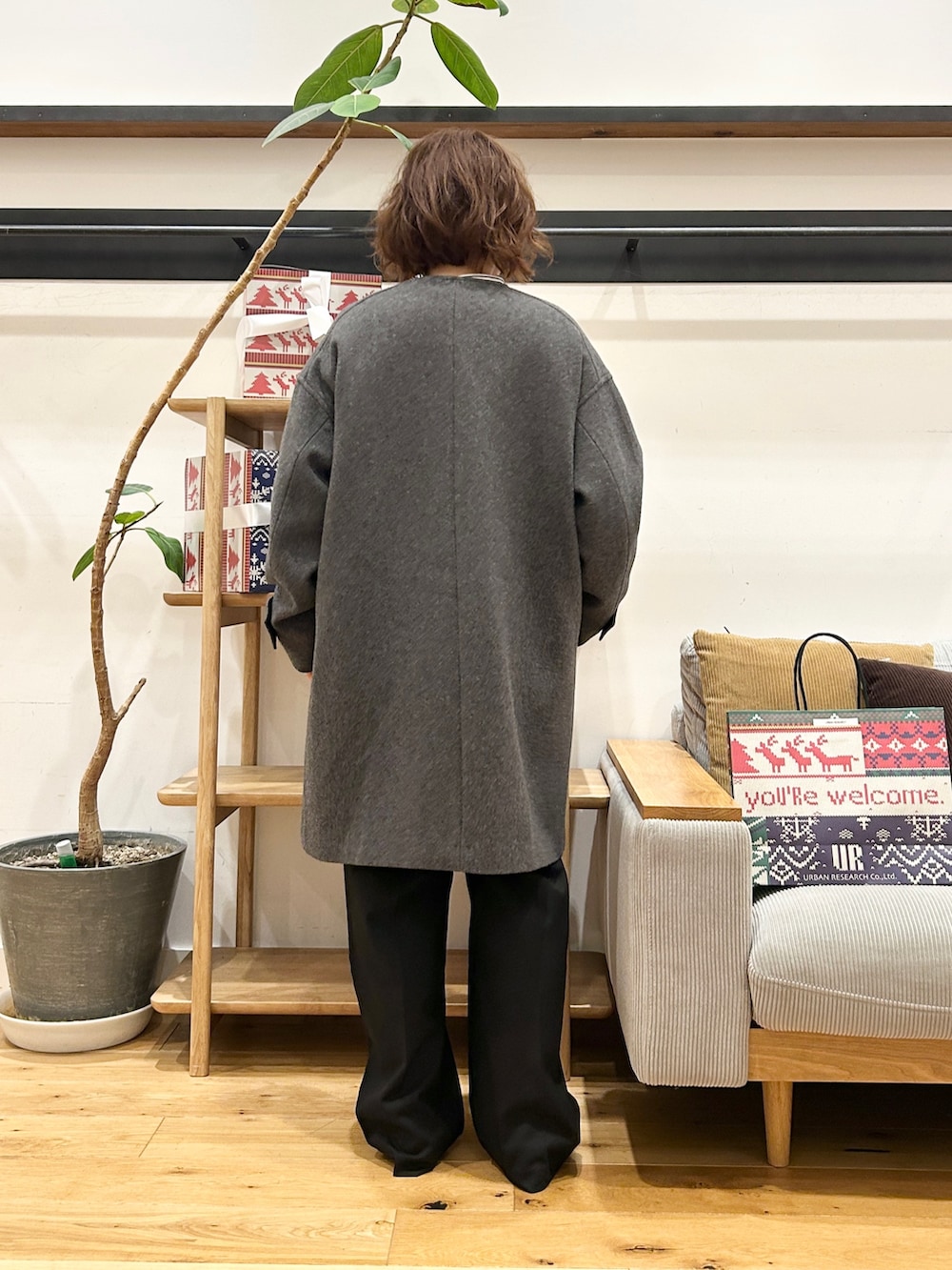 ウール100%で、きちんと感がありながらカジュアルスタイルにもおすすめなノーカラーコート。