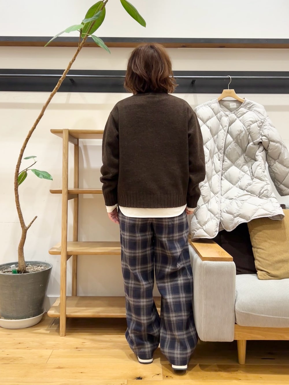 シャツやカットソーを重ねてもバランスが取りやすく、アウターの中にも着やすい一枚です。