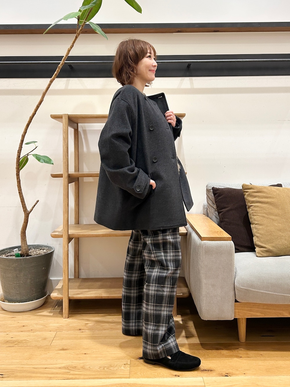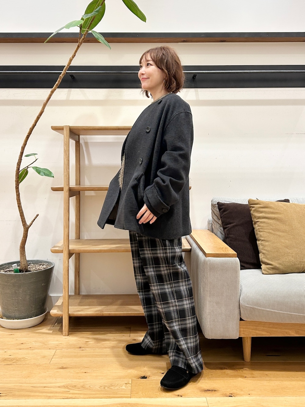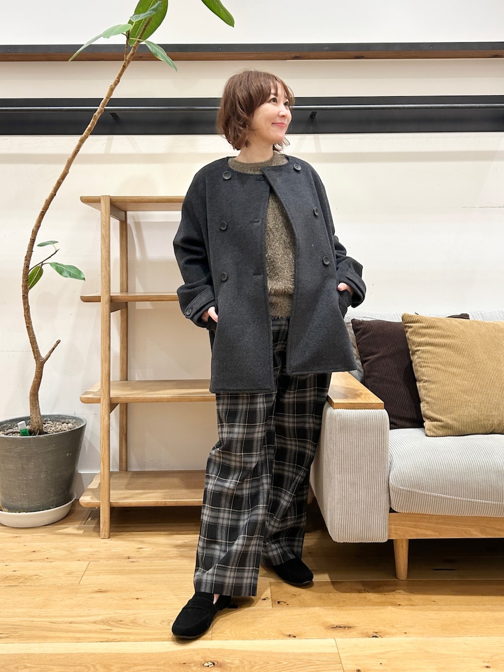 サイズ感は大きすぎず、パンツでもスカートでも合わせやすいのがポイントです。