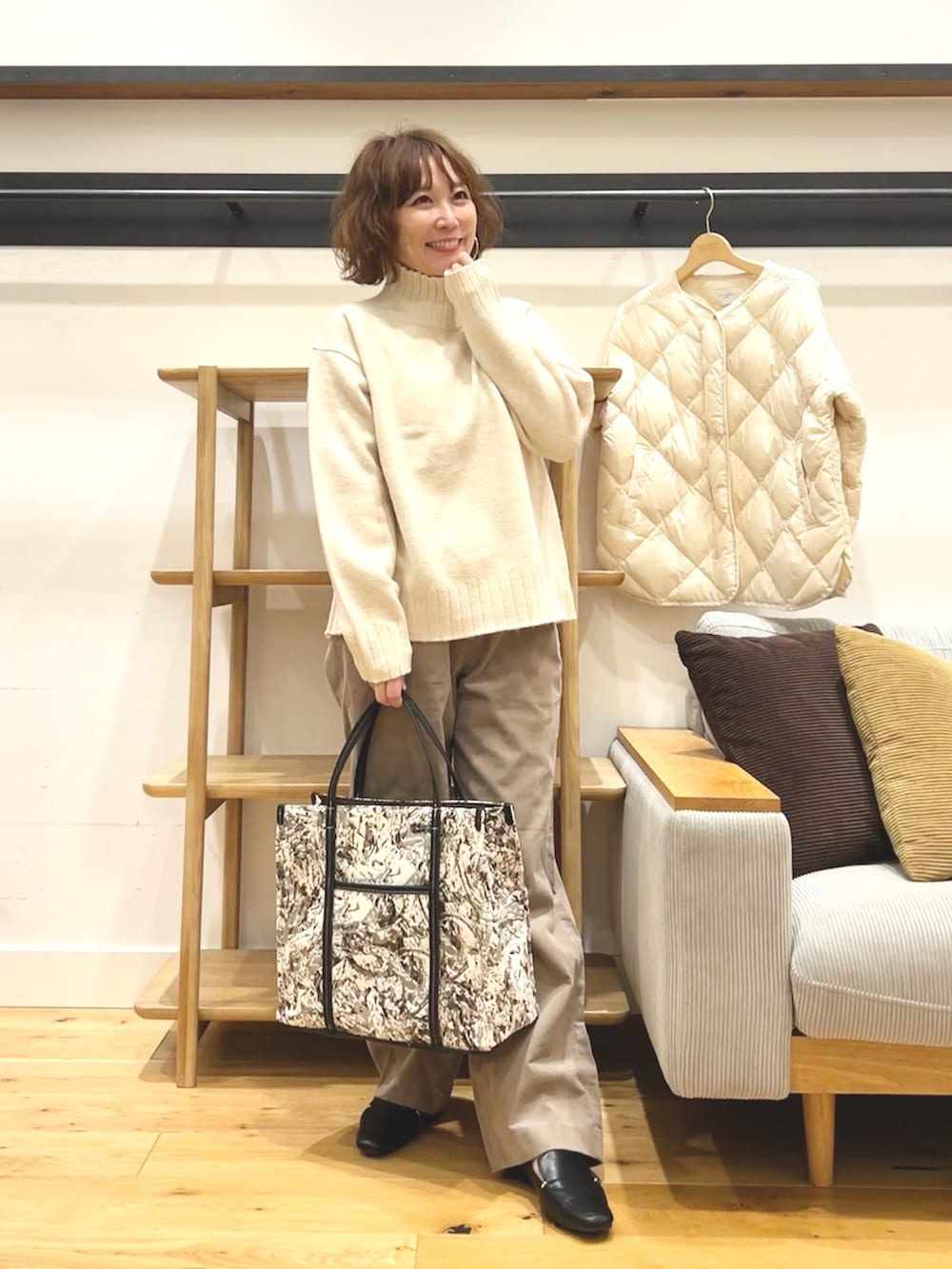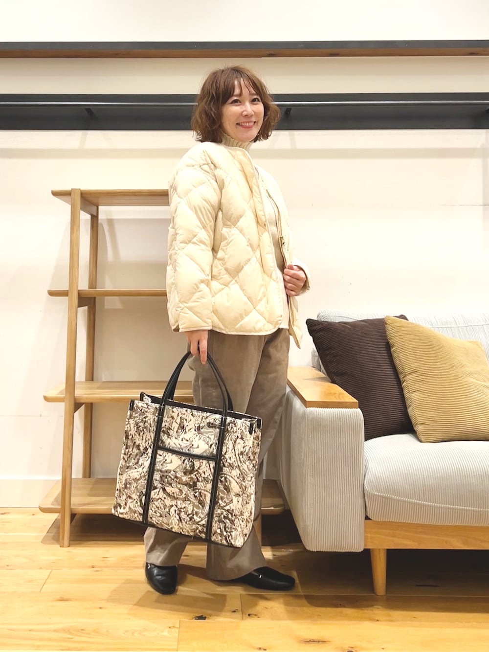 👜なんの柄か分かりませんがとにかくシンプルコーデの主役になってくれるファブリックスクエアトートバッグ。