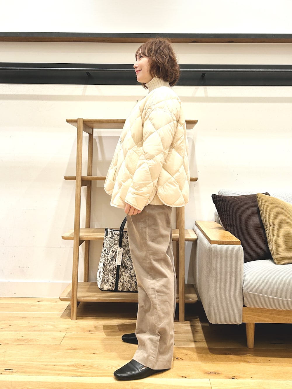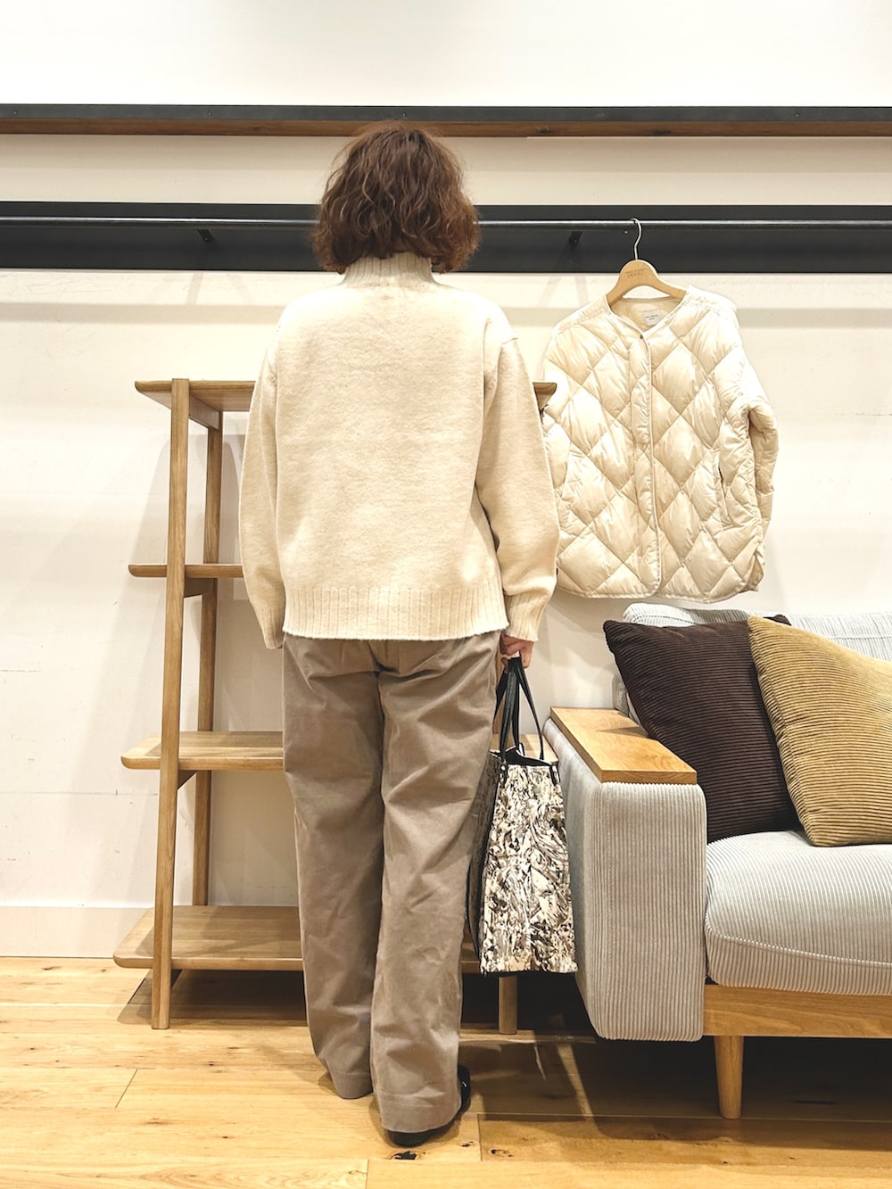 ノーカラーなので、マフラーやストール、タートルを合わせてもすっきり。