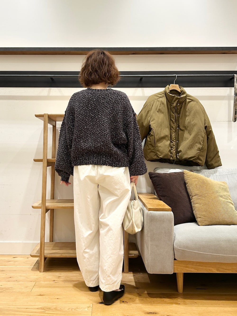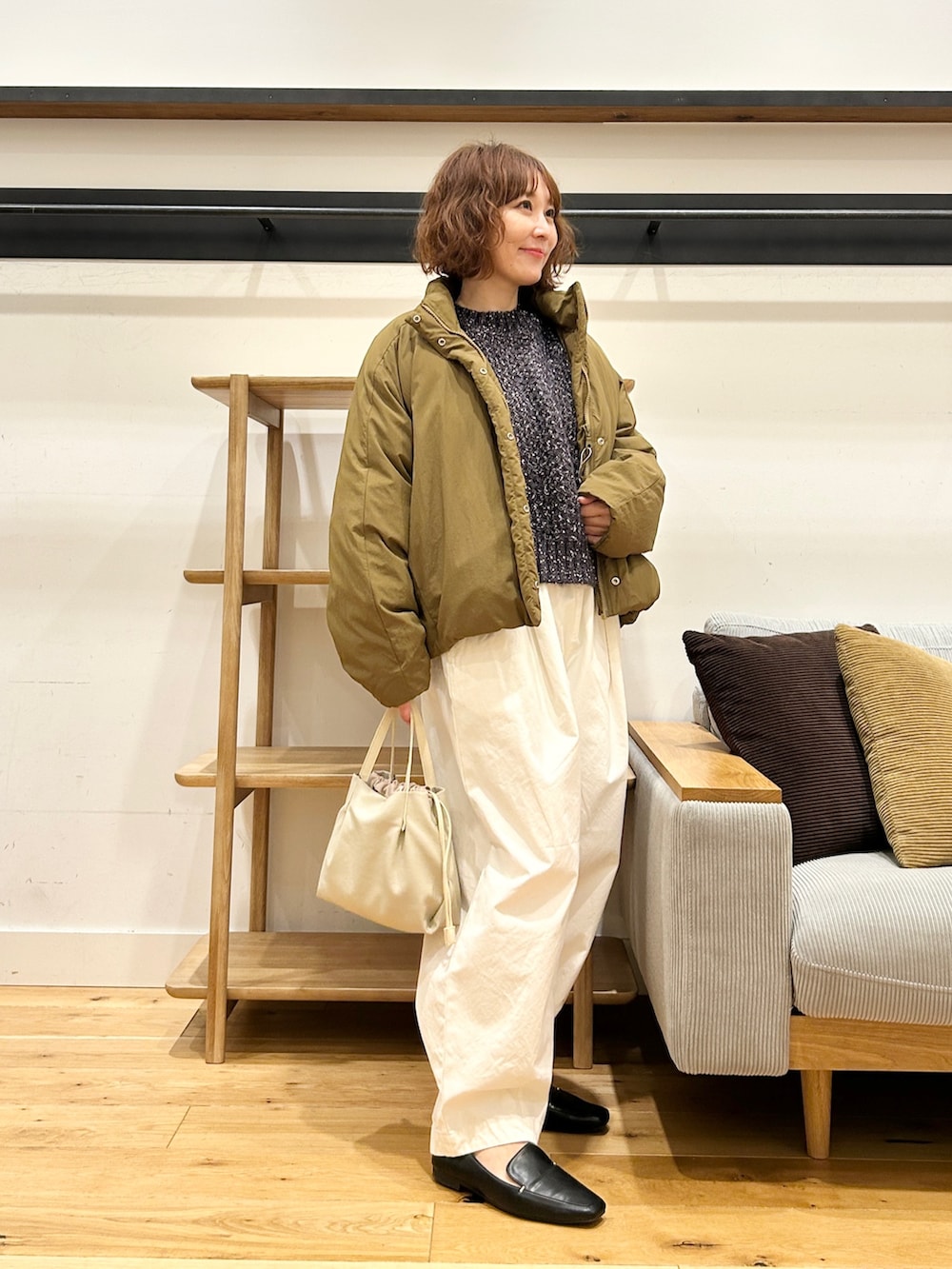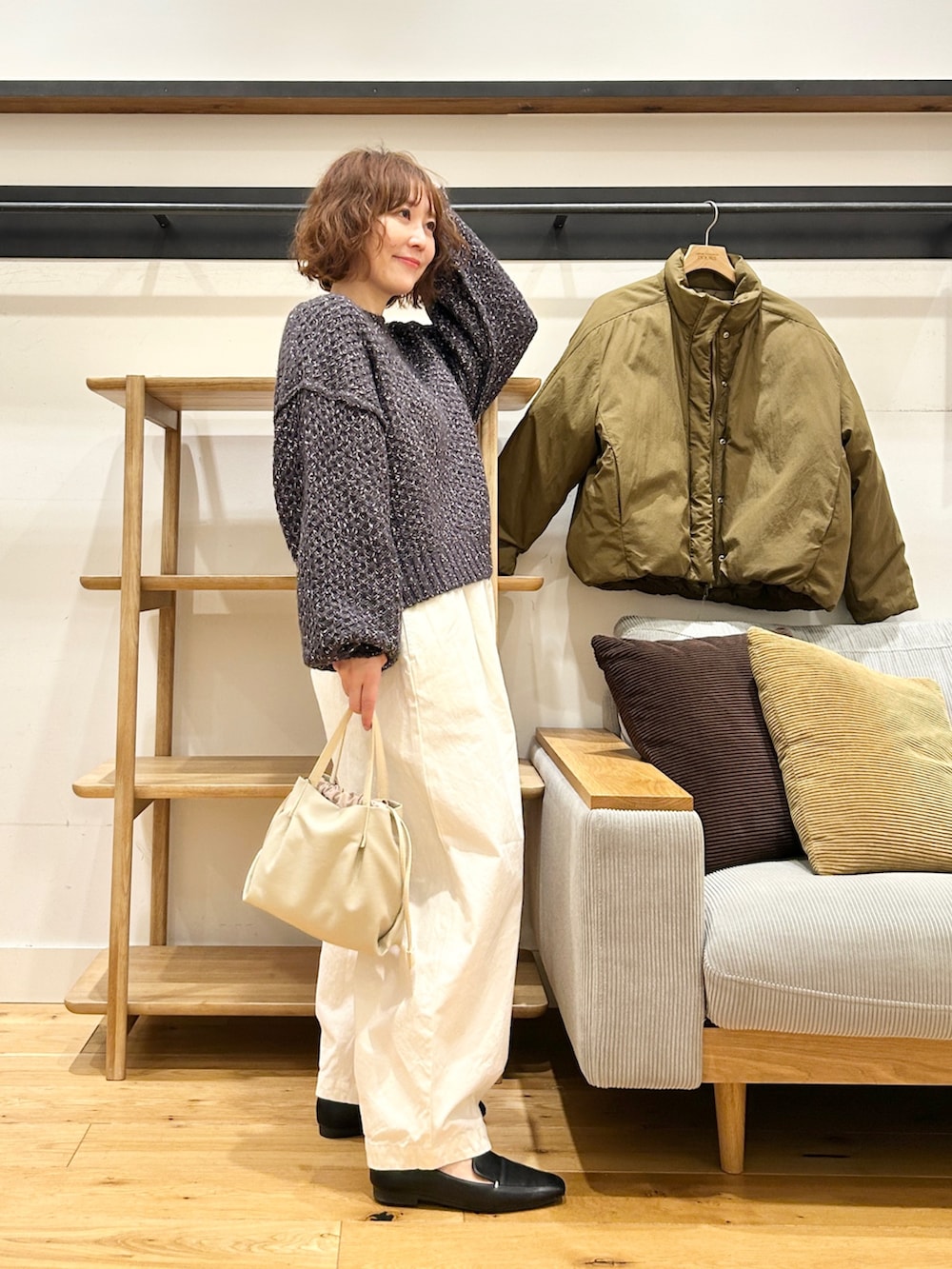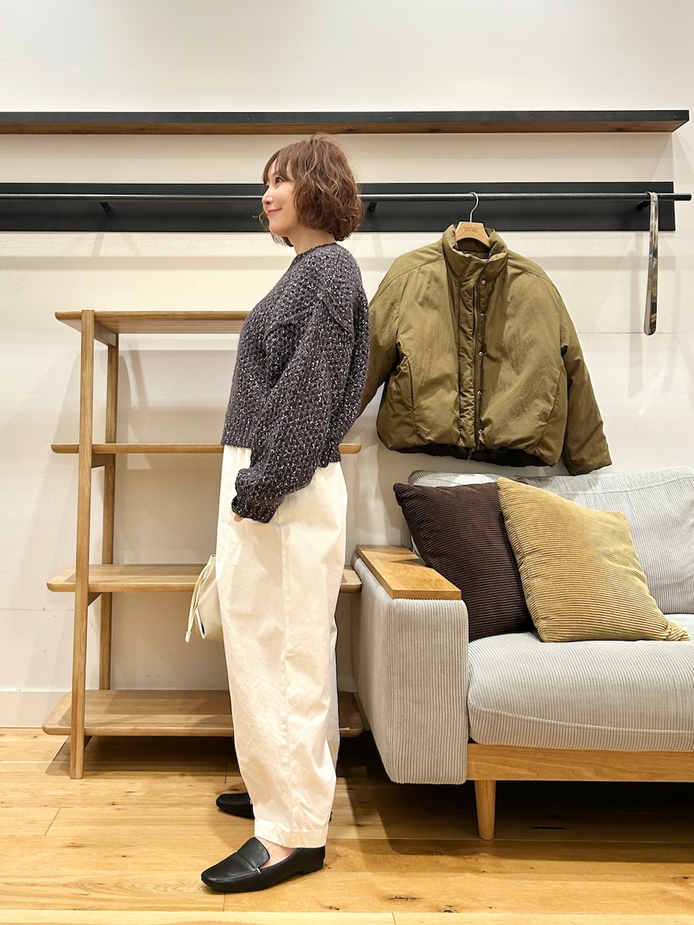 ショート丈だけど身幅にゆとりがあるから、スカートでもパンツでもバランス取りやすいです。
