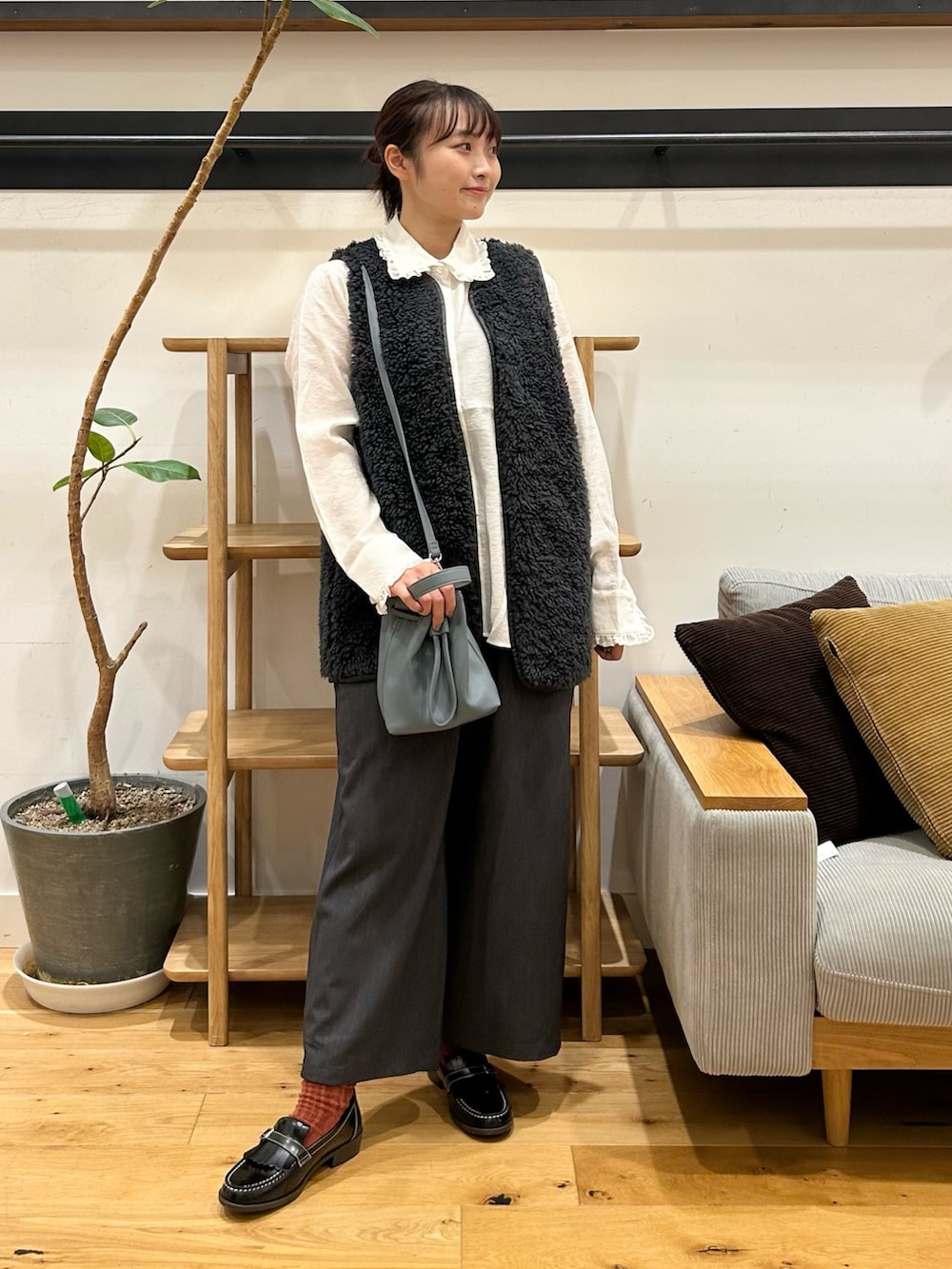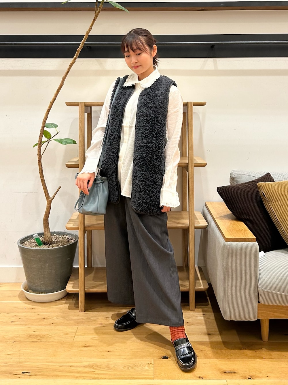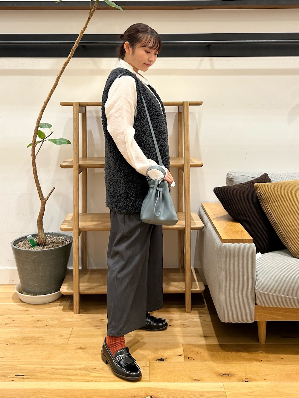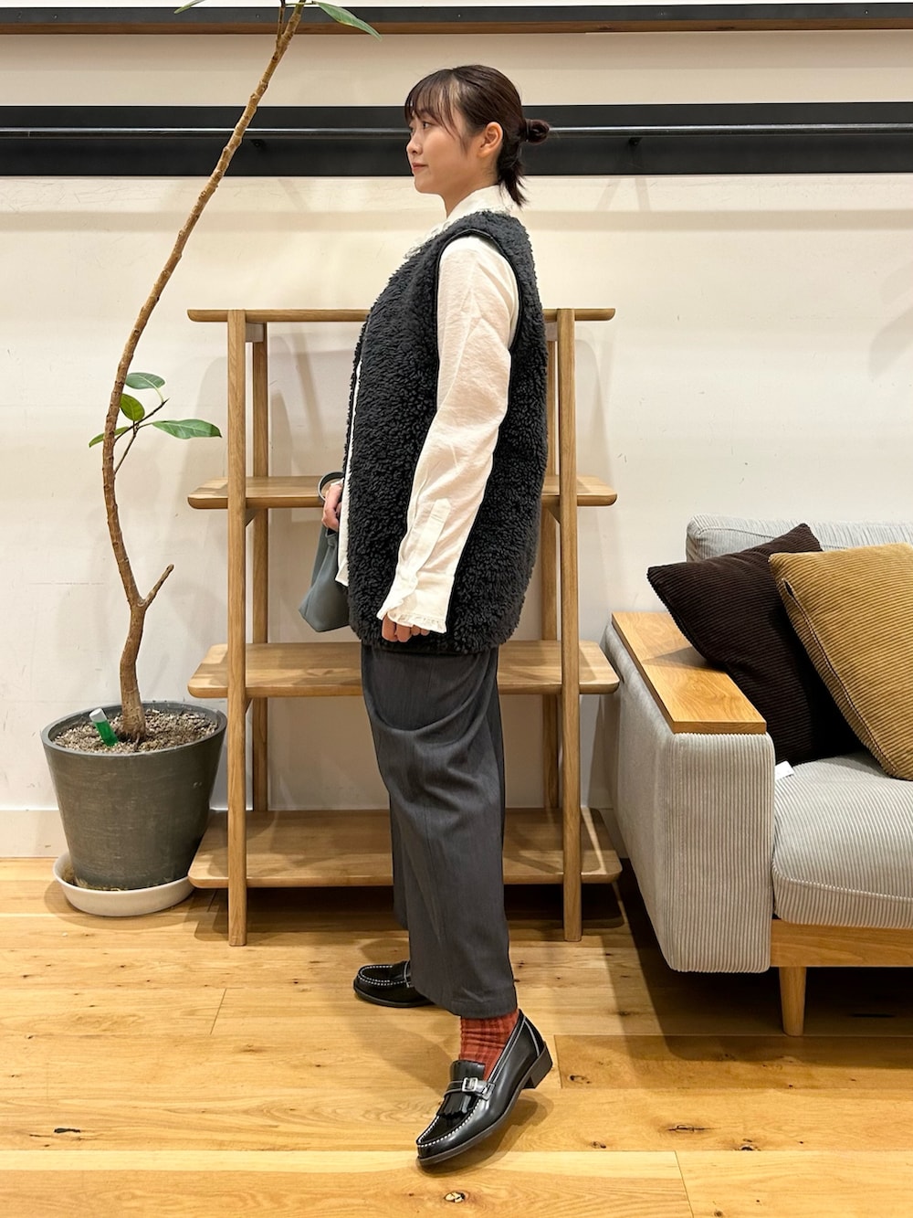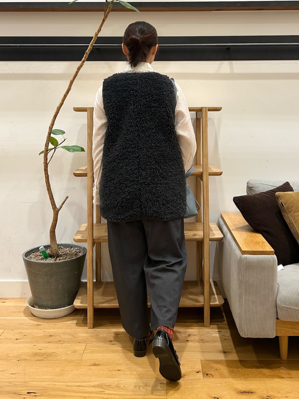 リバーシブルボアベストは、丈長めで落ち着きのある印象にしてくれるボアアイテムです。上重心になるとガタイよく見えがちな骨格ストレートにとっては、丈が少し長いだけで重心を下に分散できるおかげか、ボアアイテムの中でも着こなしやすい好印象です👀