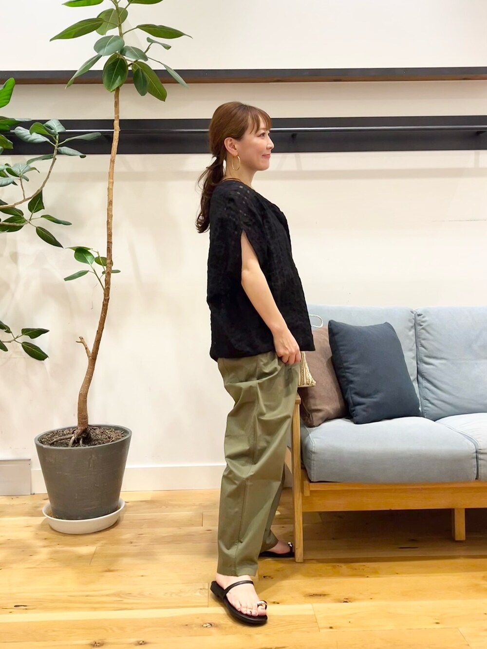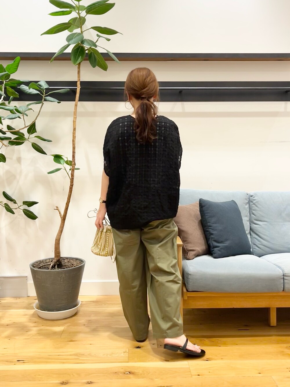 今回は全体的な形がとっても可愛いコクーンシルエットパンツのカーキを合わせています♪