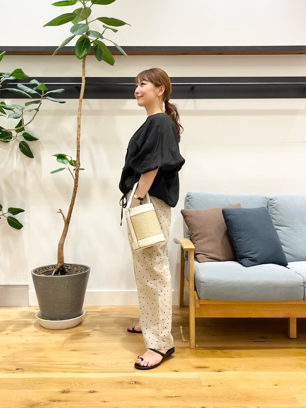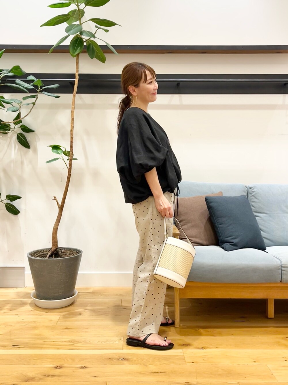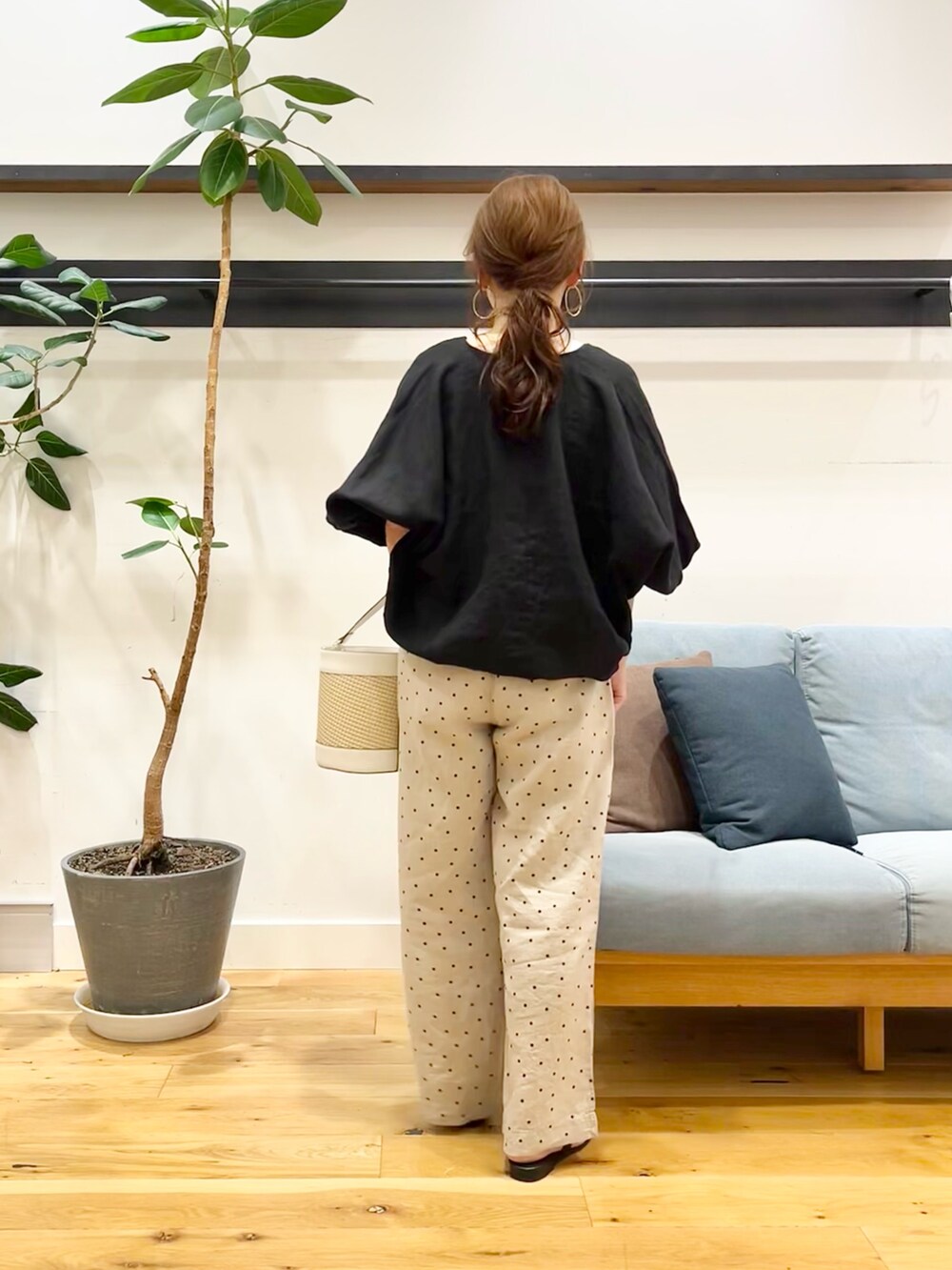 今回はシンプルながらも小さいドットがちゃんとポイントになってくれるリネンドットイージーパンツを合わせています。