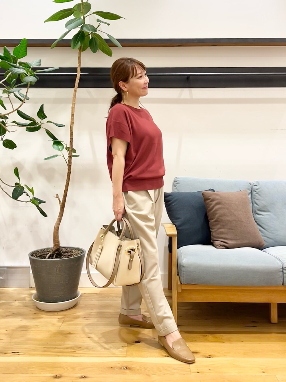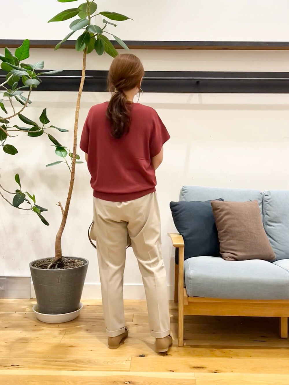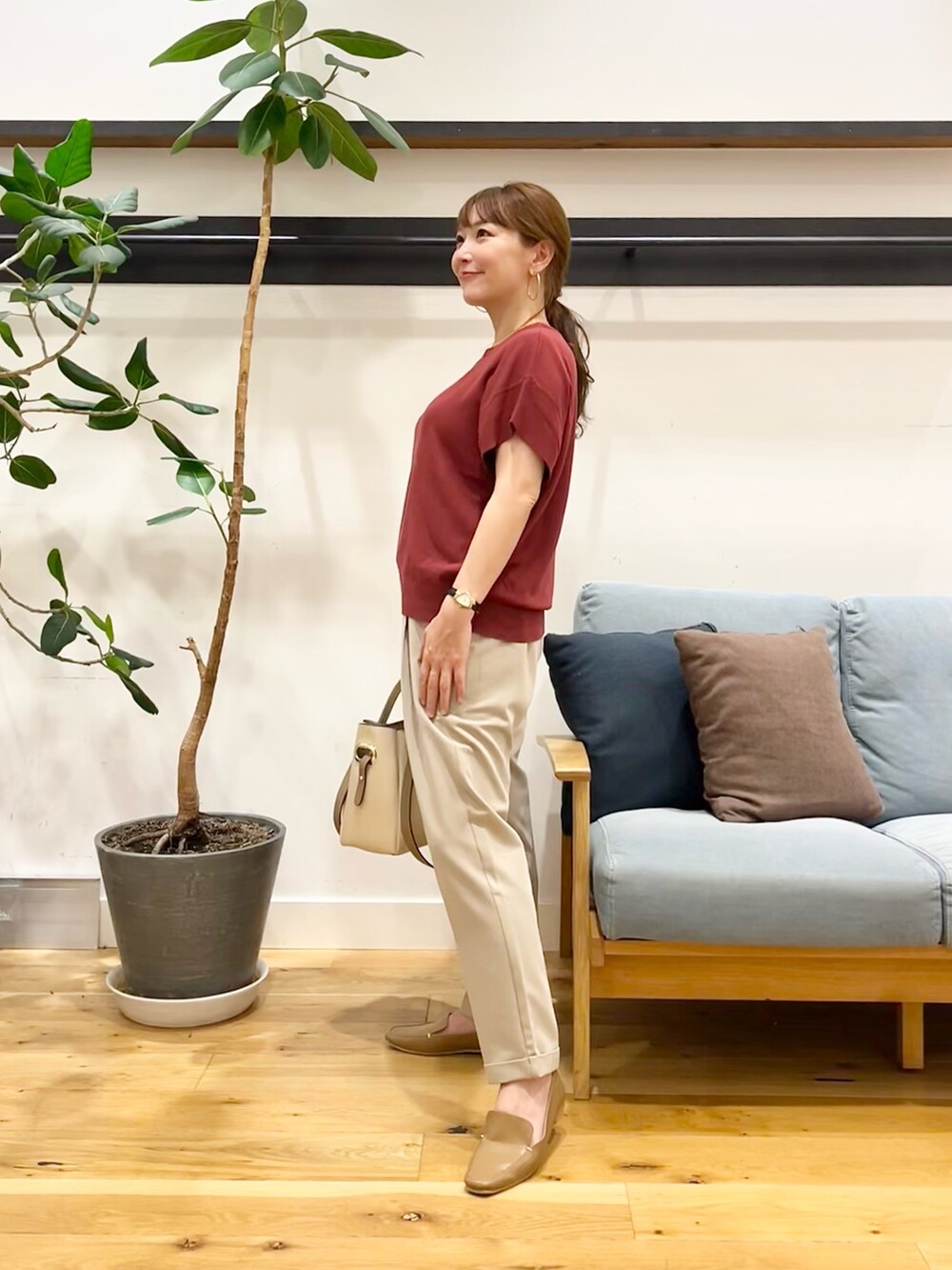 今回はストレッチテーパードイージーパンツでちょっとキレイめ、オフィスカジュアルでもいける感じのコーデにしてます。