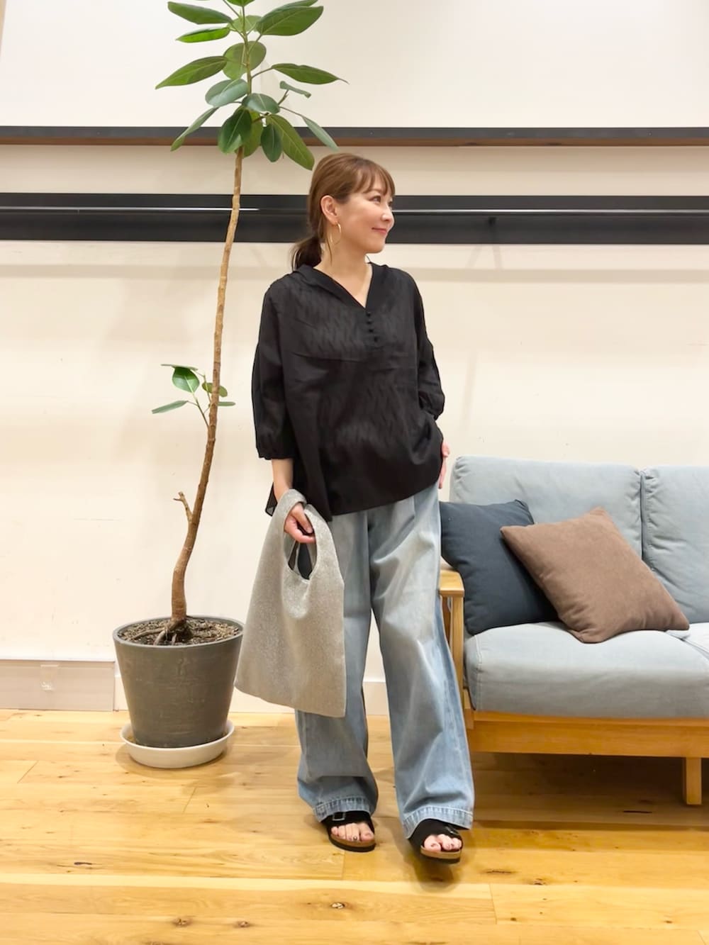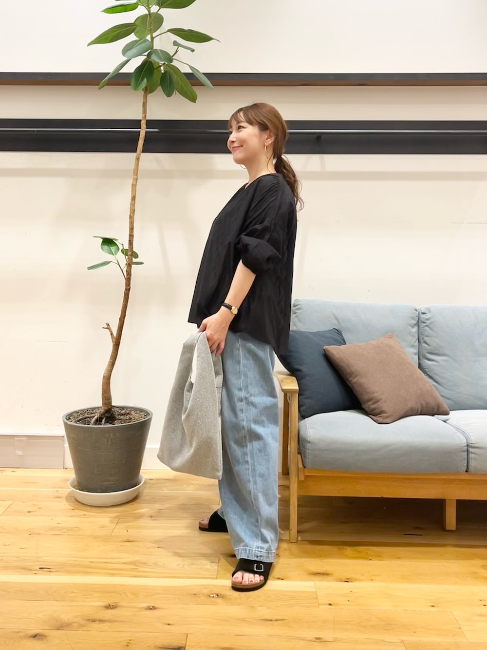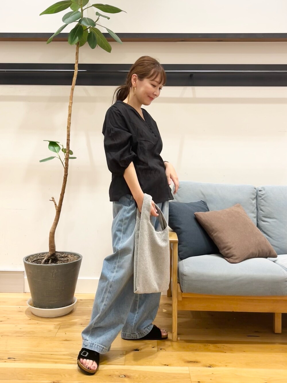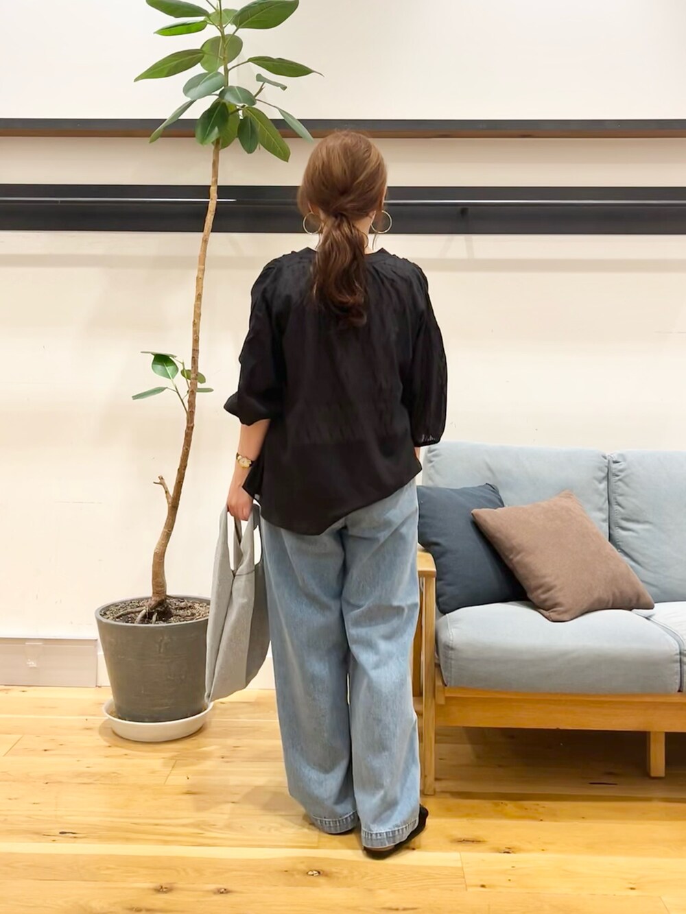 ブラウスはブラックでちょっとキリッとしてるので明るいカラーのボトムスを。