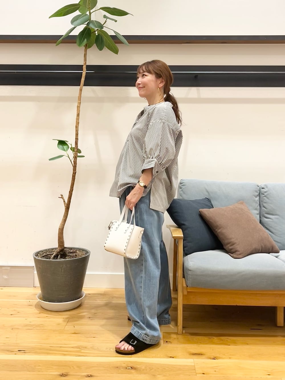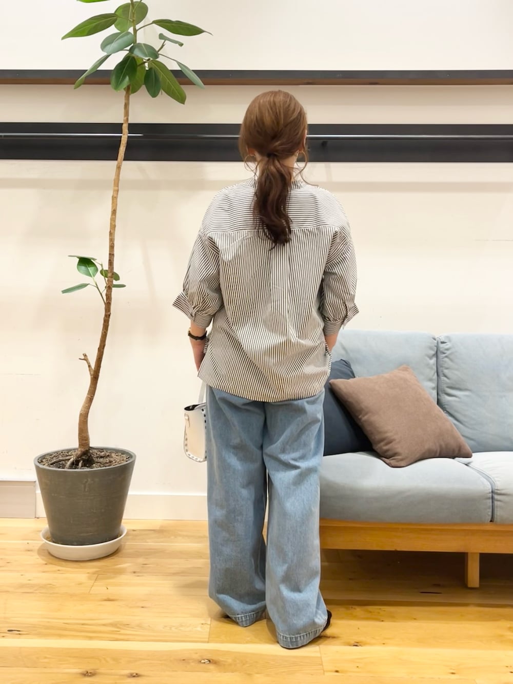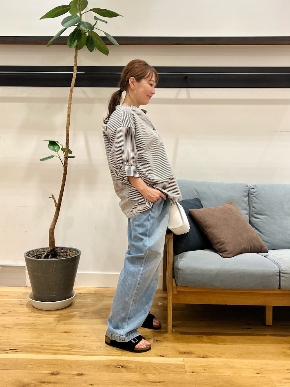 合わせてるのはかぐれのフェードデニムイージーパンツ、色あせ具合とかシルエットとかもう何合わせてもいい感じになってしまうこちら。 大きめのタックが入ってて立体感もあり、かなりゆったり楽ちんしっかり厚みがありますがとっても柔らかく、案外通年使えると思います◎ 私には長いのでトップスでウエスト隠れる時はウエストひとつ折り曲げて履いてます。(151㎝)