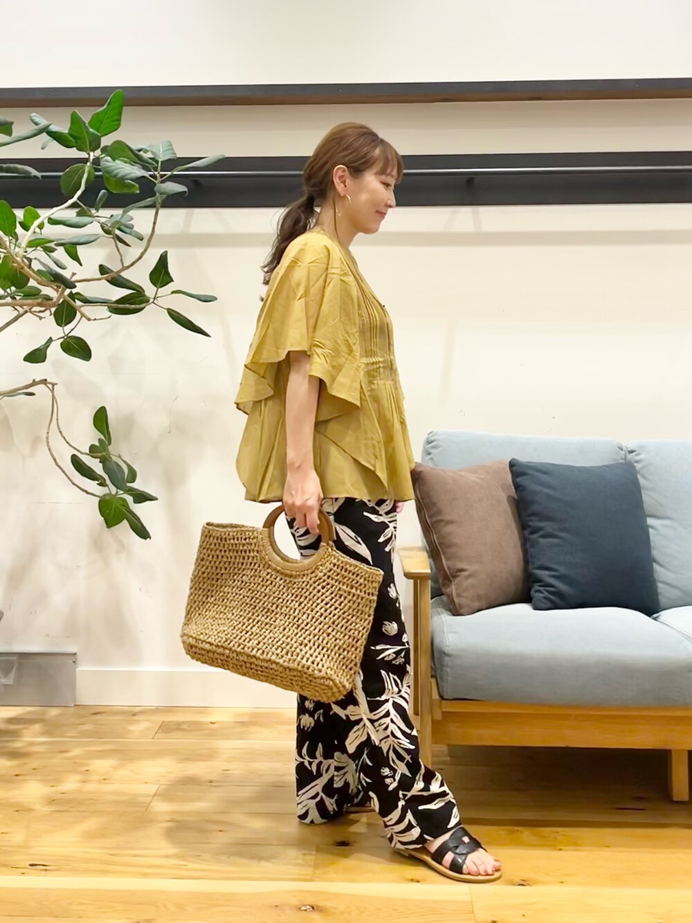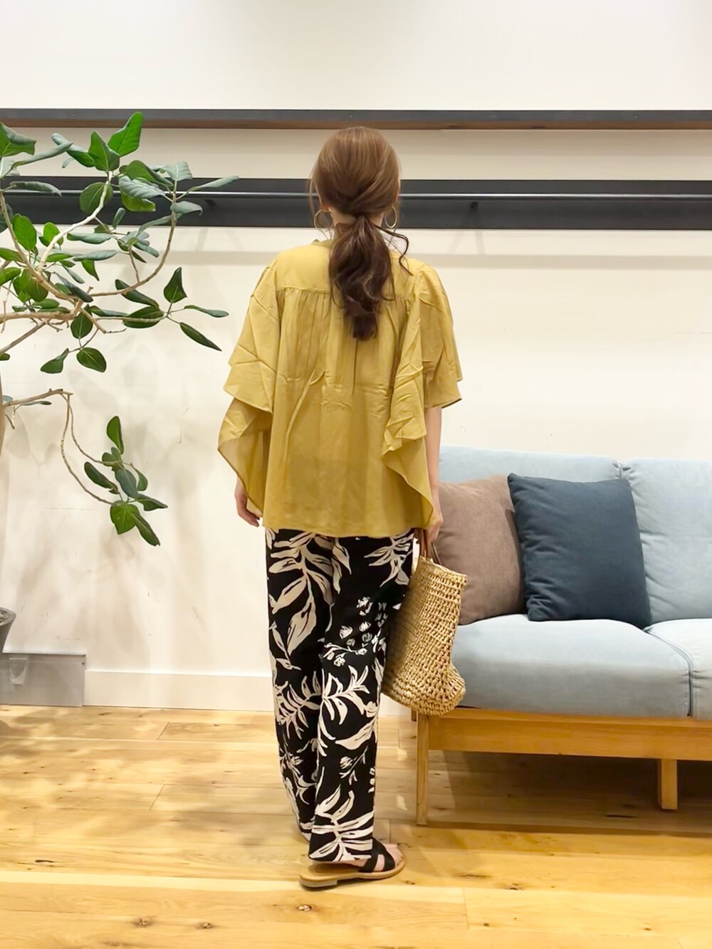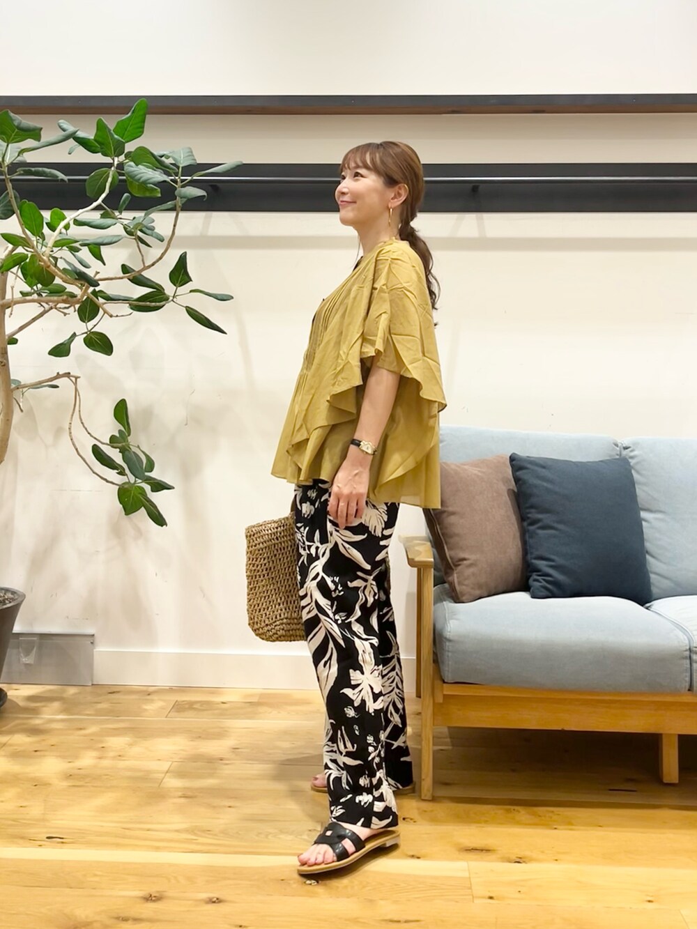 ボトムスに履いた大人気の大柄のリーフが素敵なリネンレーヨンリーフプリントパンツ。