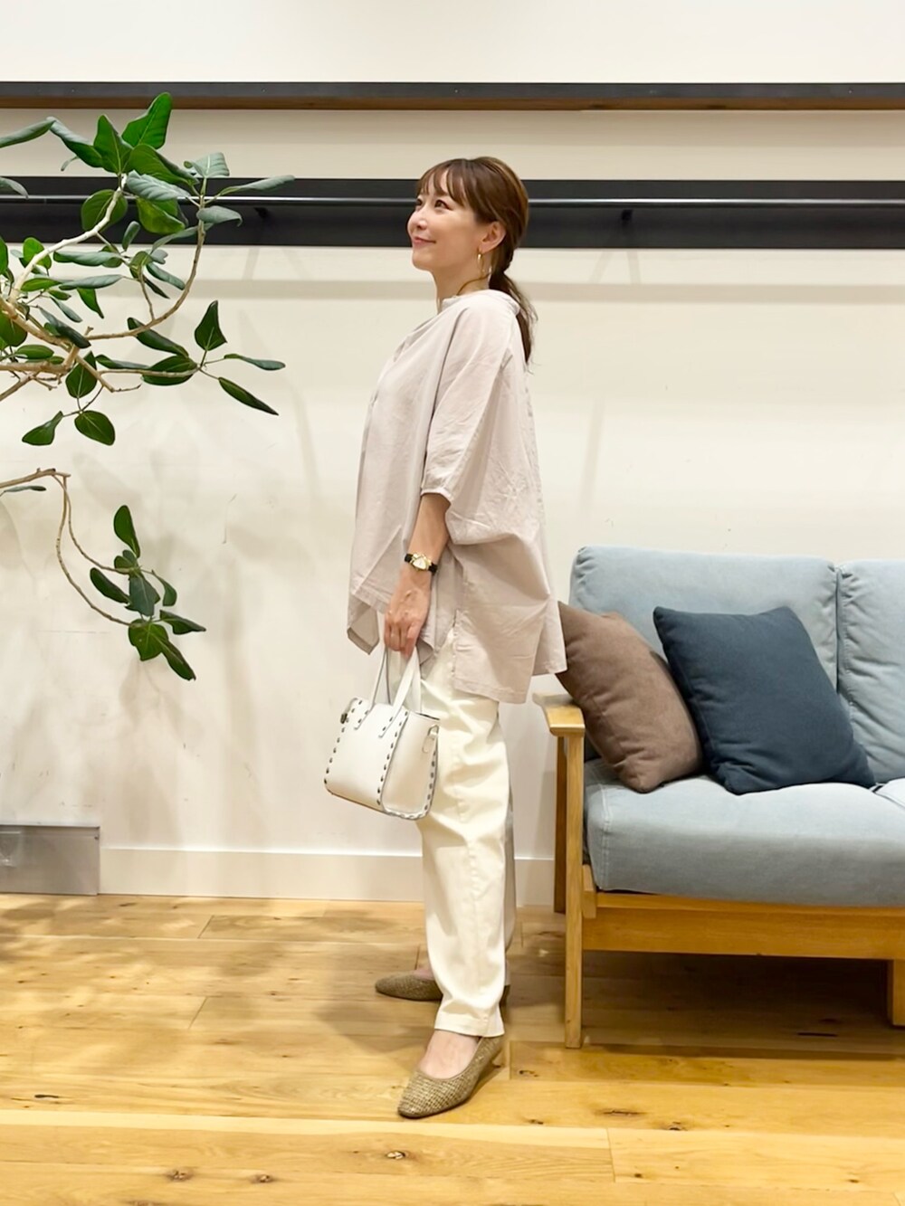 合わせてるのはおなじくかぐれのコットンストレッチイージーパンツです。 太めなシルエットが多いかぐれの中では ちょっとスッキリシルエットです、が全然ゆとりはあります。 ウエストもゴムなので楽ちんに履いていただけます♪ 私はウエストひとつ折って履いてます。(151㎝) 眩しすぎないやさしい白なので色んなトップスと合わせていただきやすいです◎(^^)