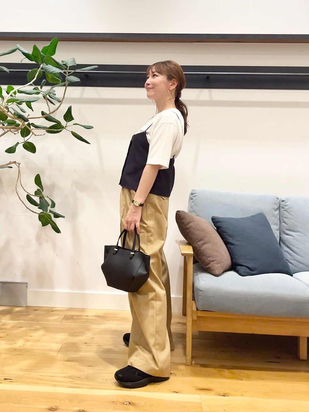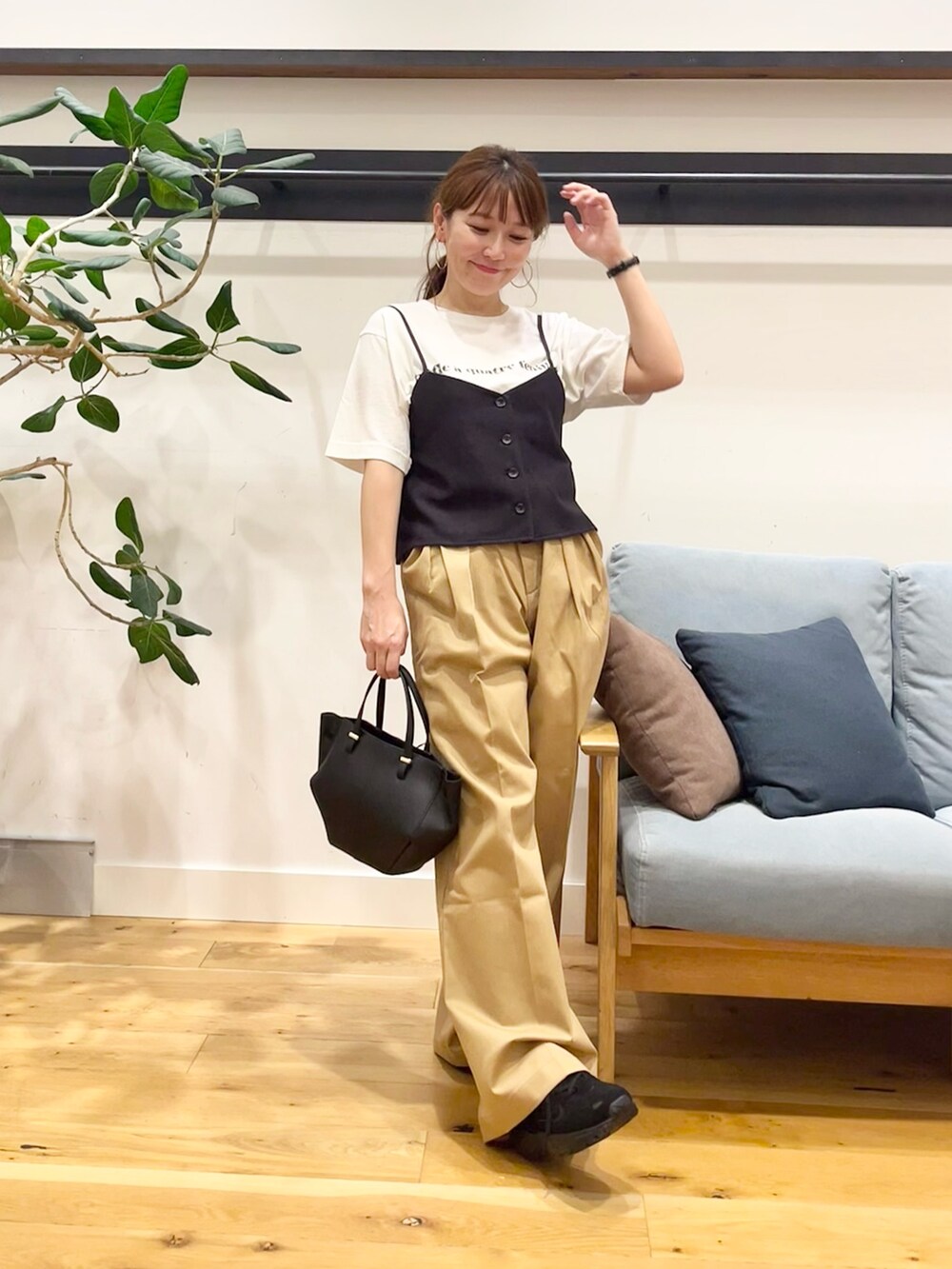 ボトムスにはチノワイドパンツを合わせてます。
