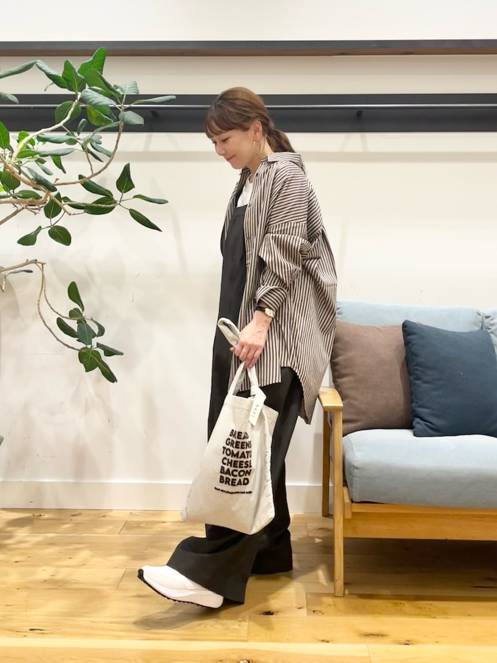 ストライプシャツは厚みのでやすい骨格ストレートさんもスッキリ見えるかなりおすすめアイテムですよ◎