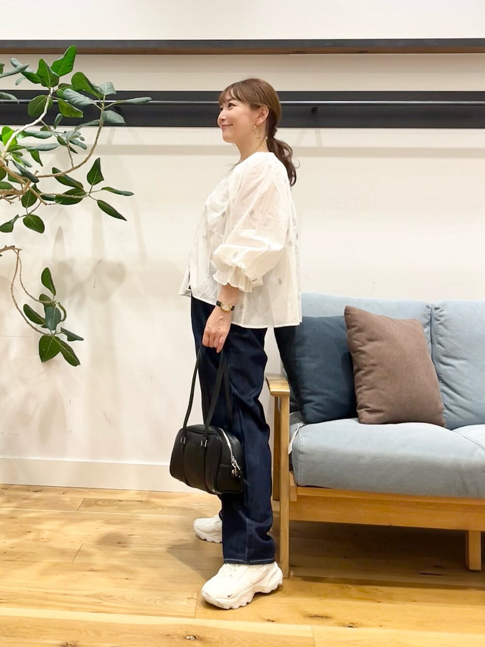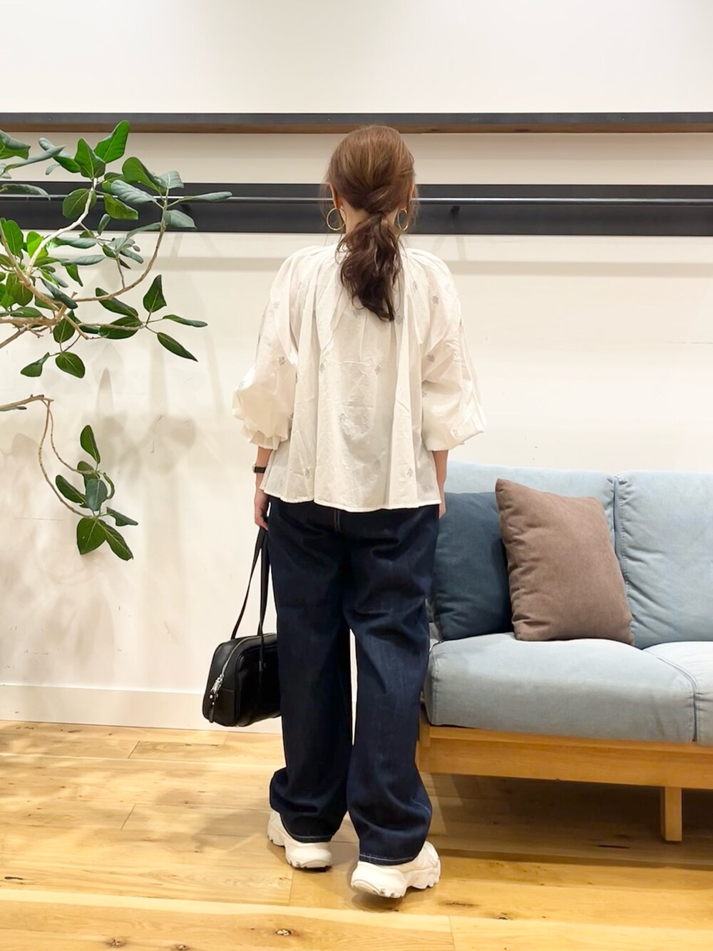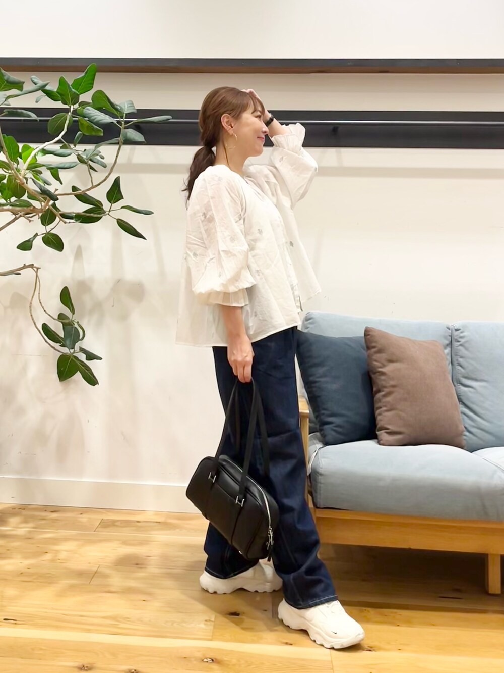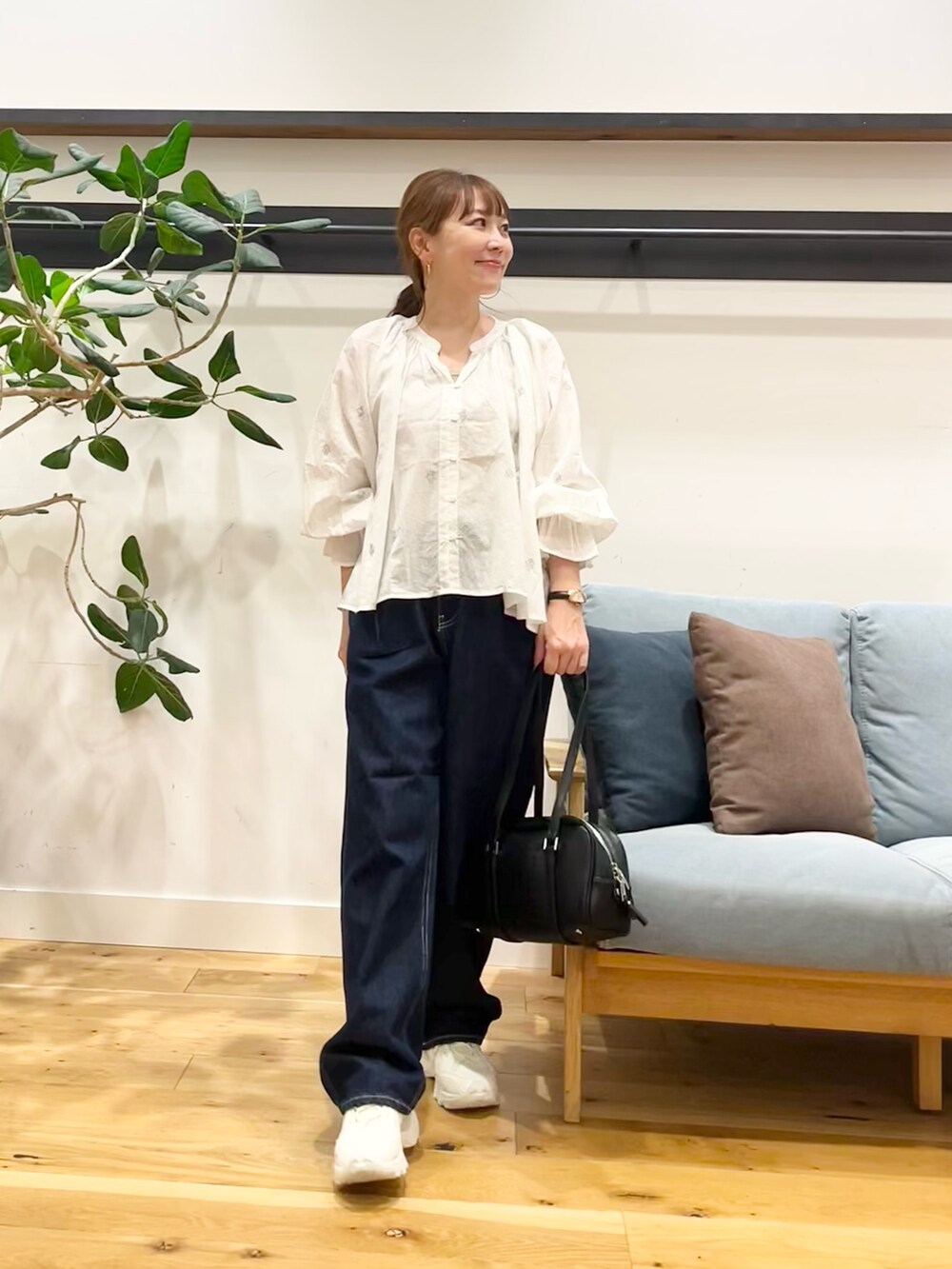 着てみるとこのブラウス結構着丈短かかったのでお腹フィットするボトムスより太いパンツ合わせる方が私は安心でございます◎