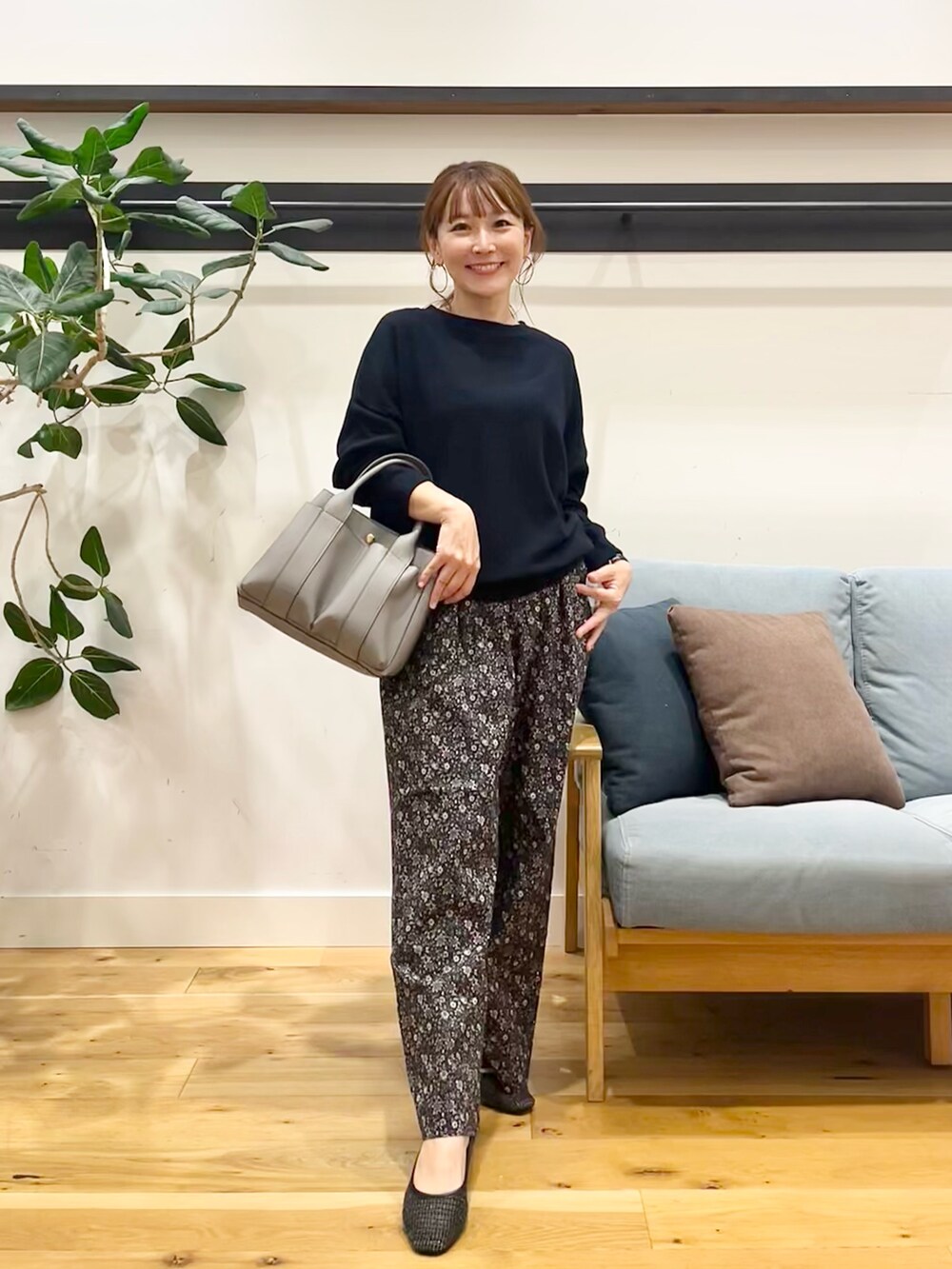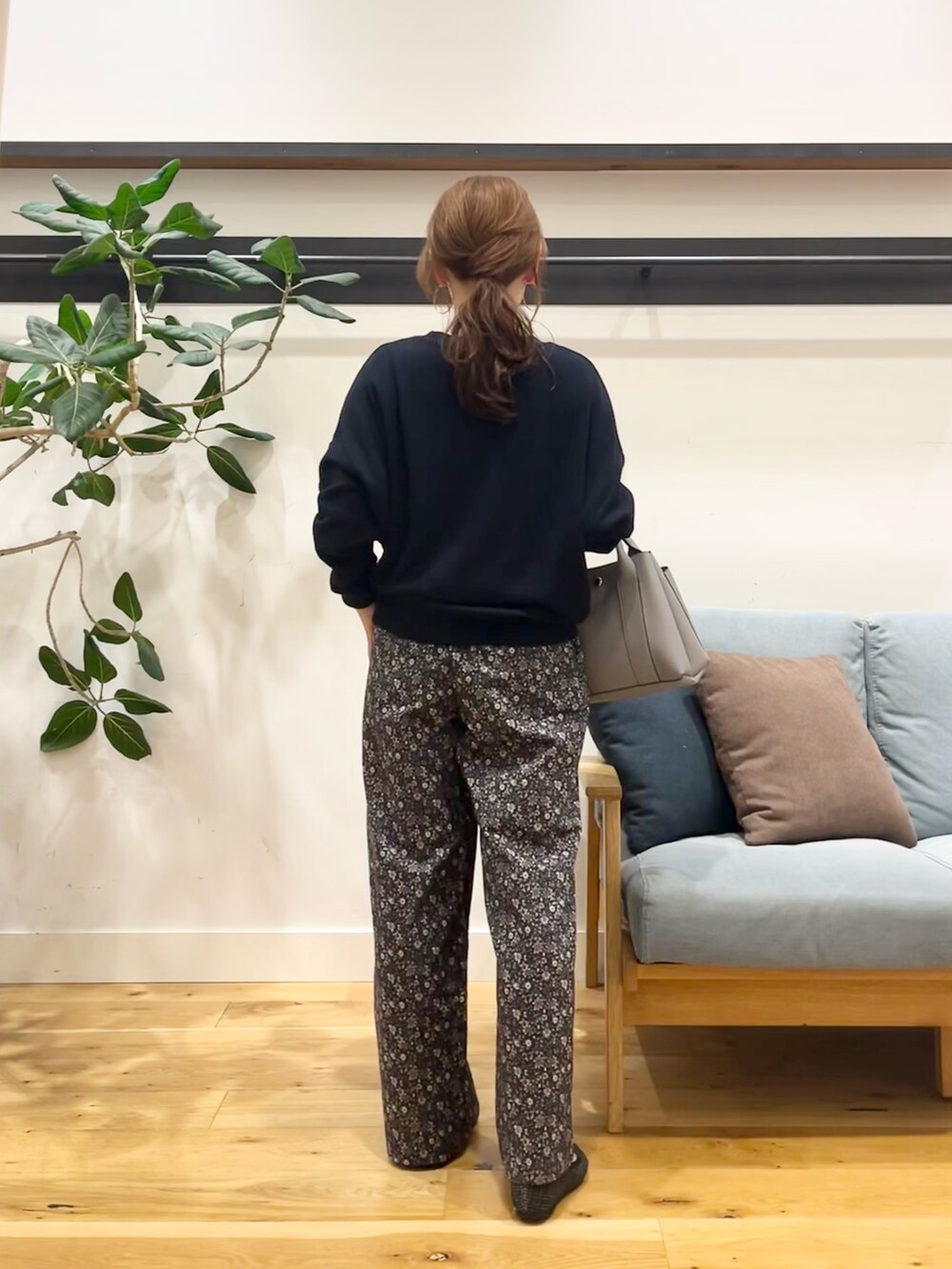 小さい細やかなお花と派手すぎないワインカラーが大人可愛いイージーパンツ。
