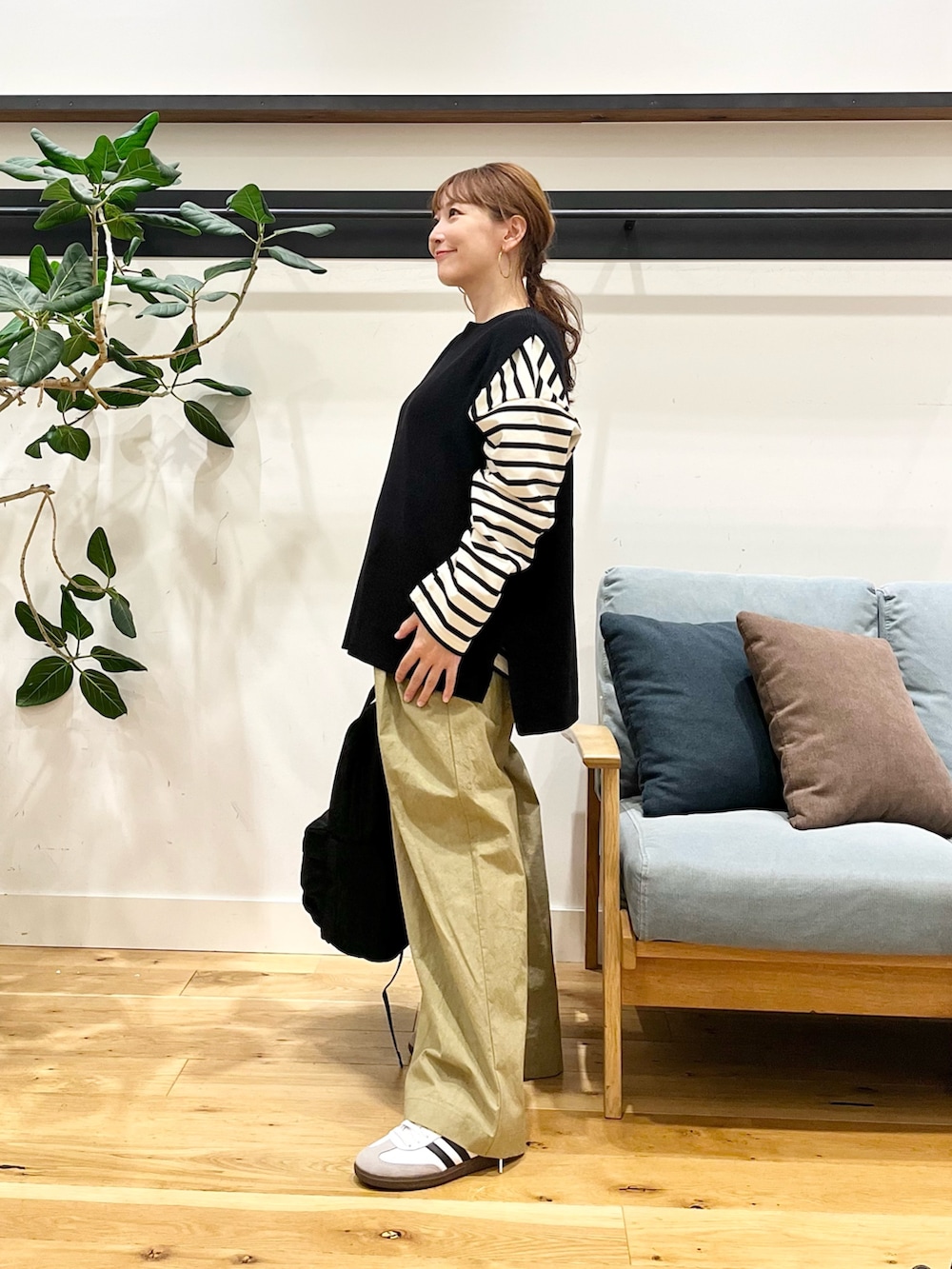 こちらのベストは綿100%のドライタッチなので、まだ暑いねんという方はキャミやタンクトップと合わせてもらってノースリーブで着たりTシャツに合わせたりで今から着ていただけます!
