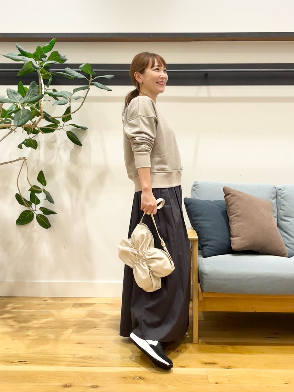 着丈が短めなので、ボトムスはピタピタしたのんより太めのパンツ、スカートなどゆとりのあるものが安心でバランスも良いかと思います◎