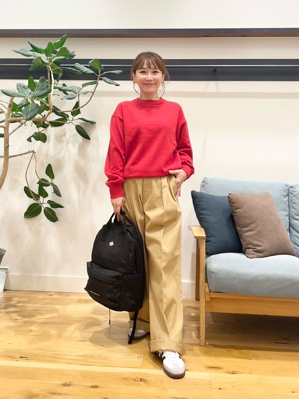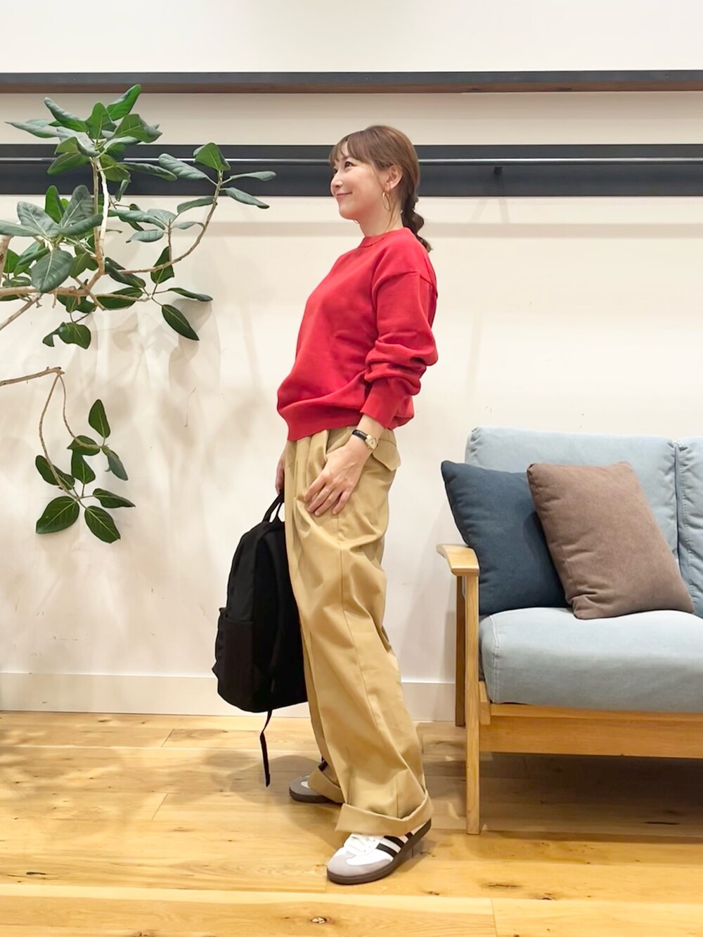 今回はカジュアルにチノワイドパンツを合わせてます。 いい感じにタックが入った太めシルエット。 やのになんでワンサイズしかないの!😭 正直そのままでは私にはかなり長いのでロールアップしてます。ウエストもちょっと大きいのでベルトは必須です。(151㎝) とはいえ、シルエットに特徴あるダボっとチノ、ちょっと新鮮でこれはこれでありなんじゃないでしょうかね♪(^^)