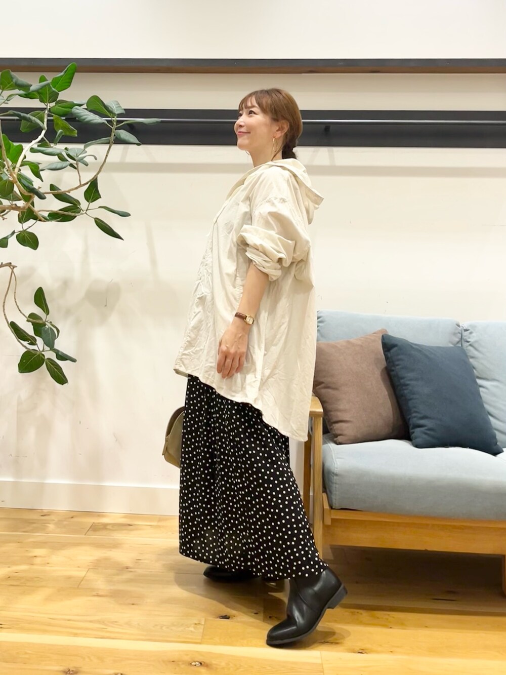 いつもならパンツ合わせにするとこですが、意外とスカートも可愛いかなと思って、同じくかぐれのドットギャザースカートを合わせました。