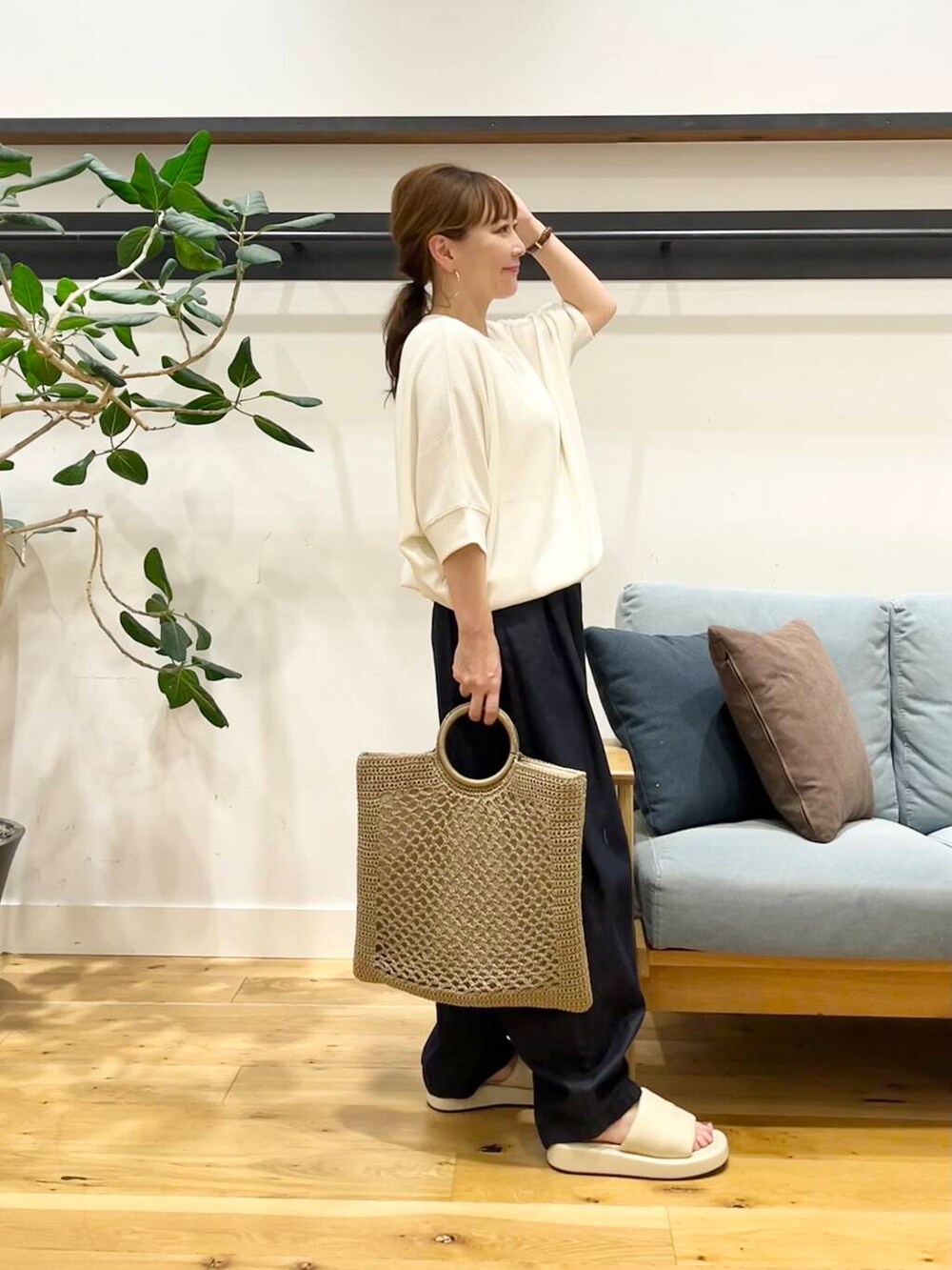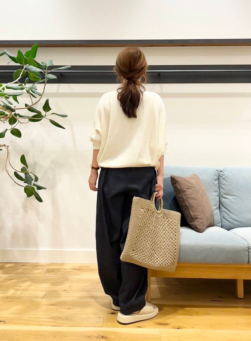 裾のリブ部分でちょうどいい位置にまとまってくれるので、ボトムス選ばずに着ていただける万能トップスです♪