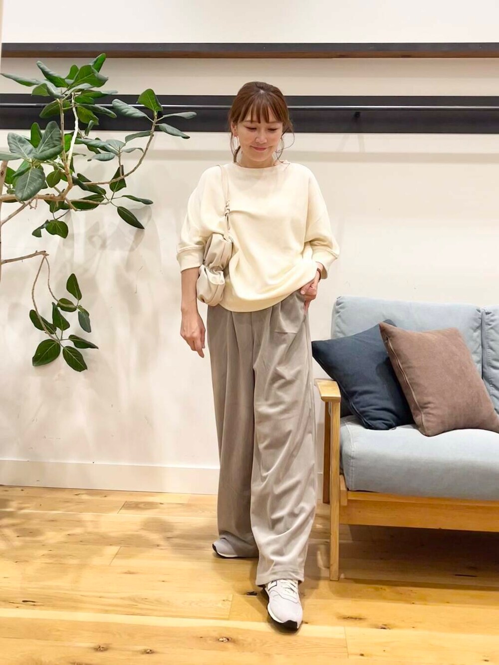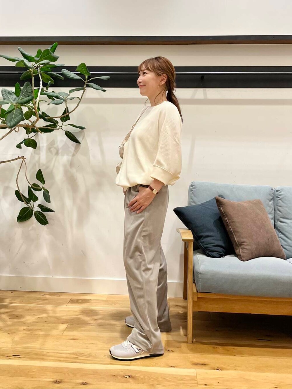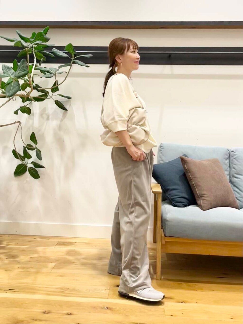 裾のリブ部分でちょうどいい位置にまとまってくれるので、ボトムス選ばずに着ていただける万能トップスです♪