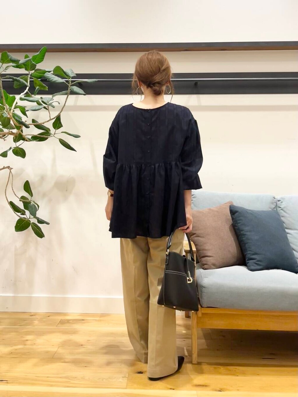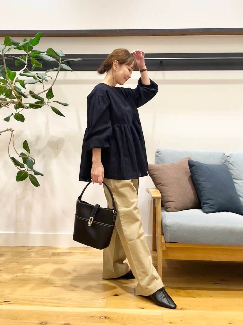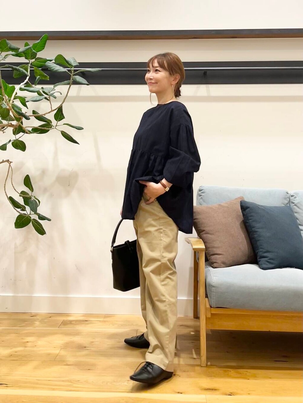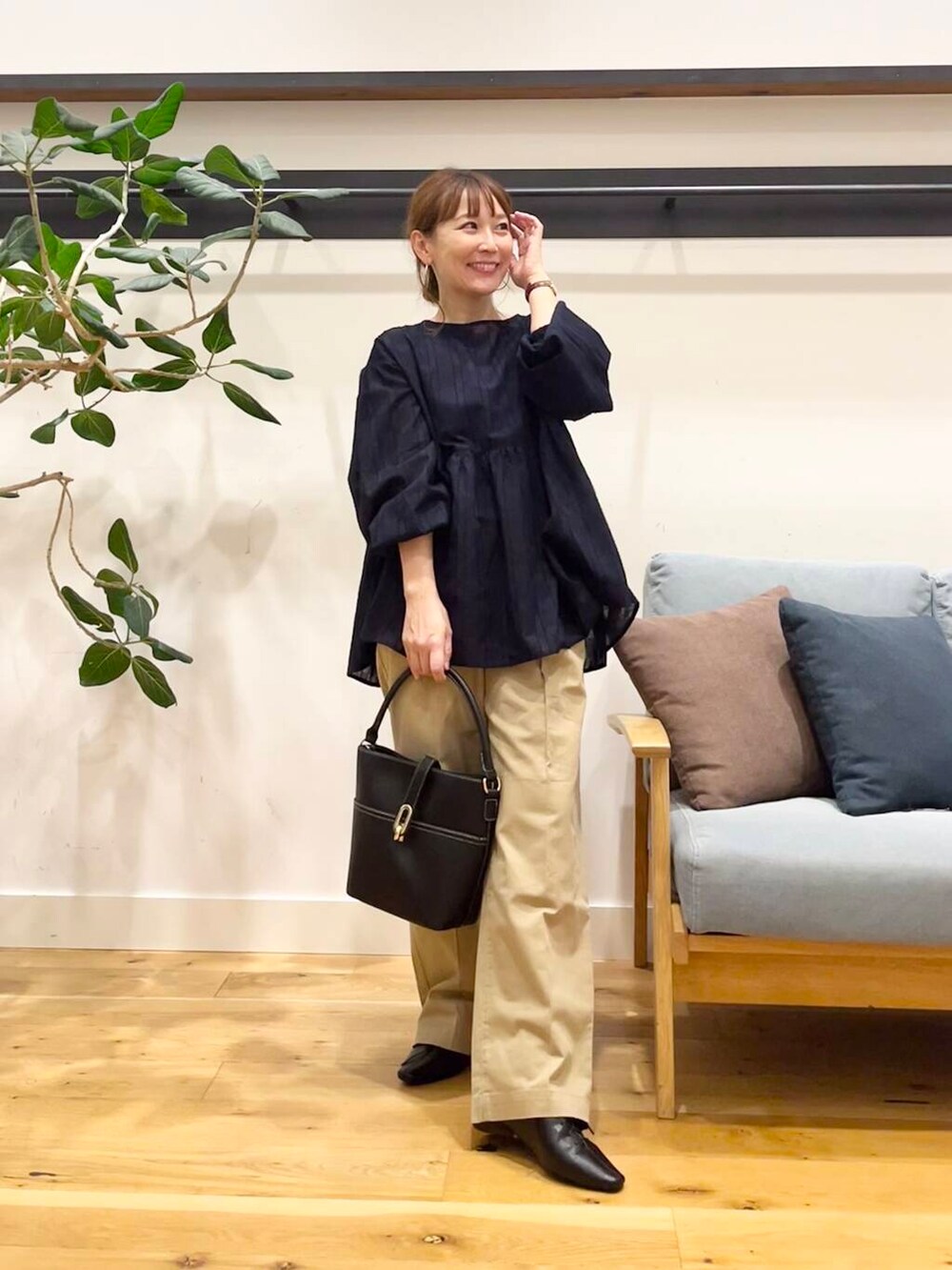 袖口はゴムになってるのでプッシュアップして手首を出すとこんなふんわりブラウスもスッキリ見えます。