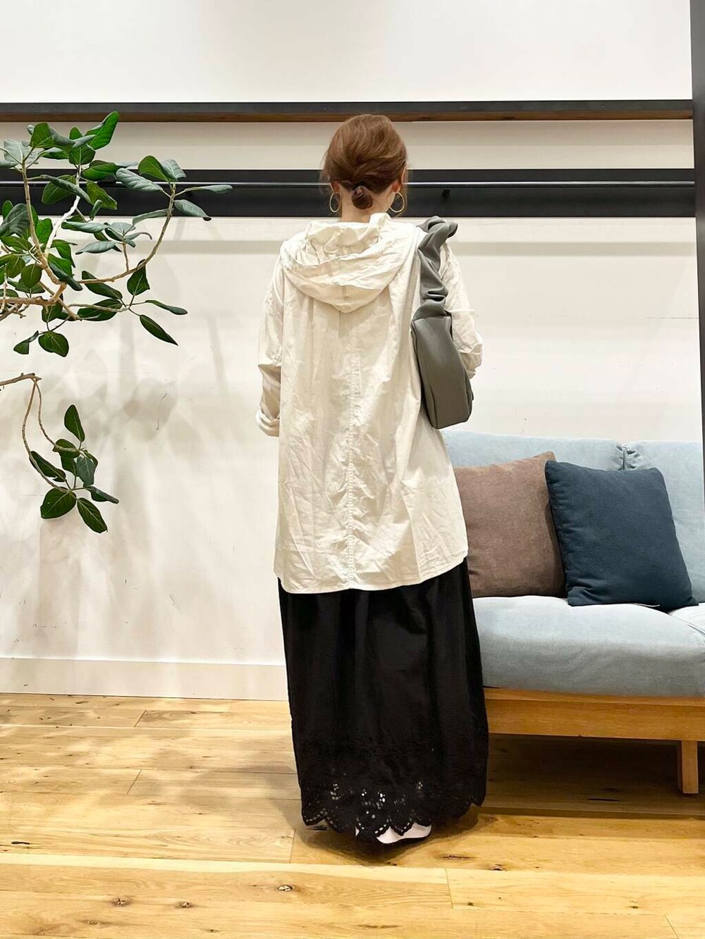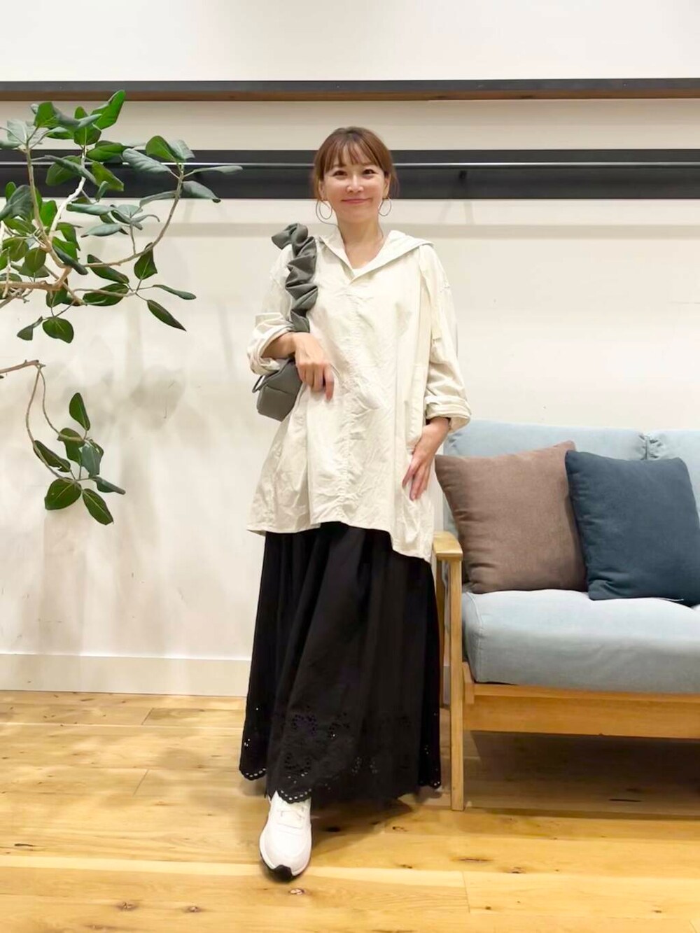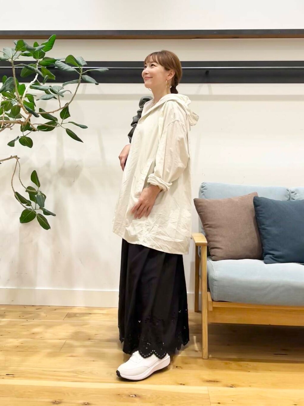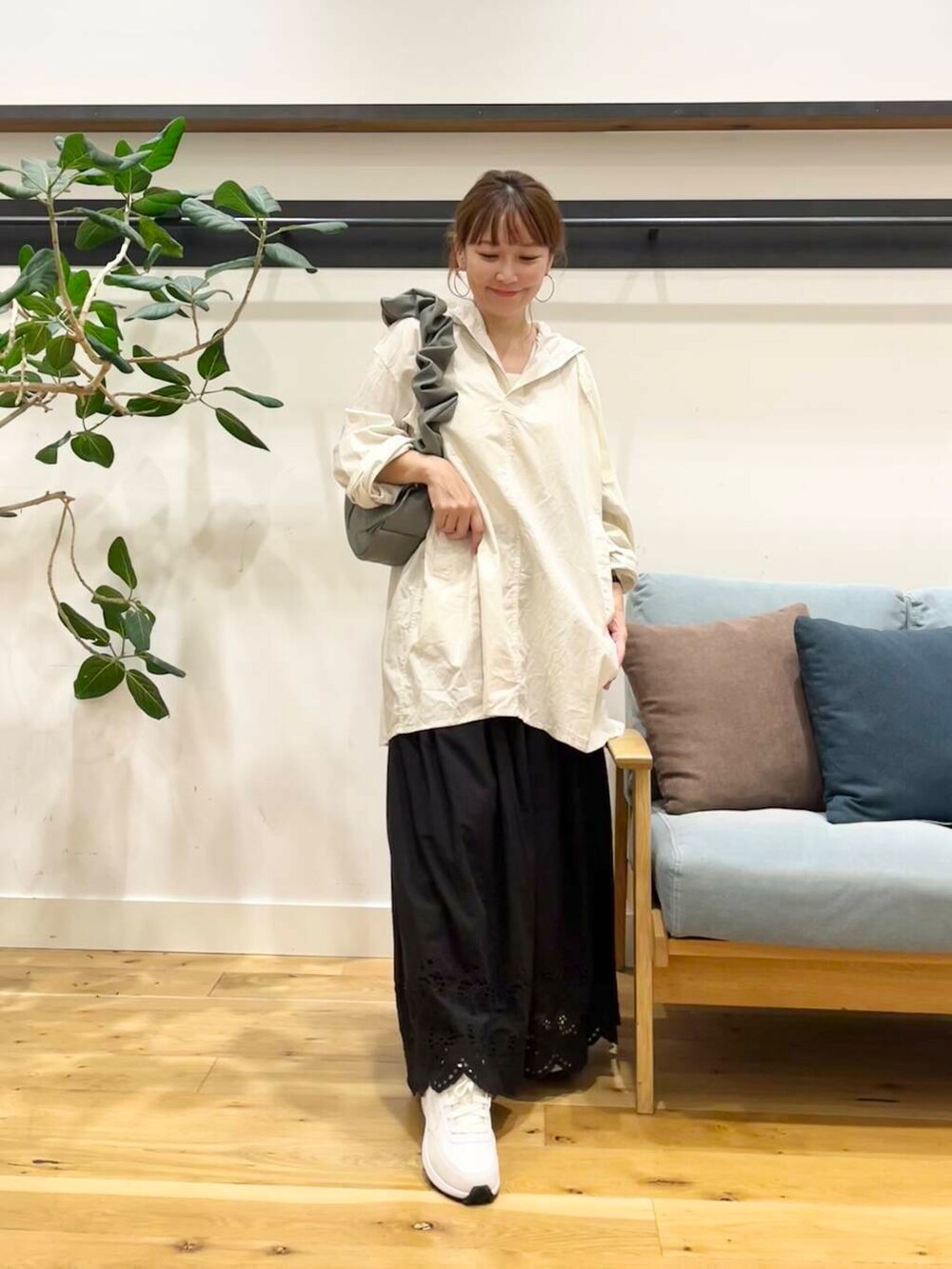 女性らしい雰囲気のかぐれのスカラップ刺繍ギャザースカートを合わせてます。