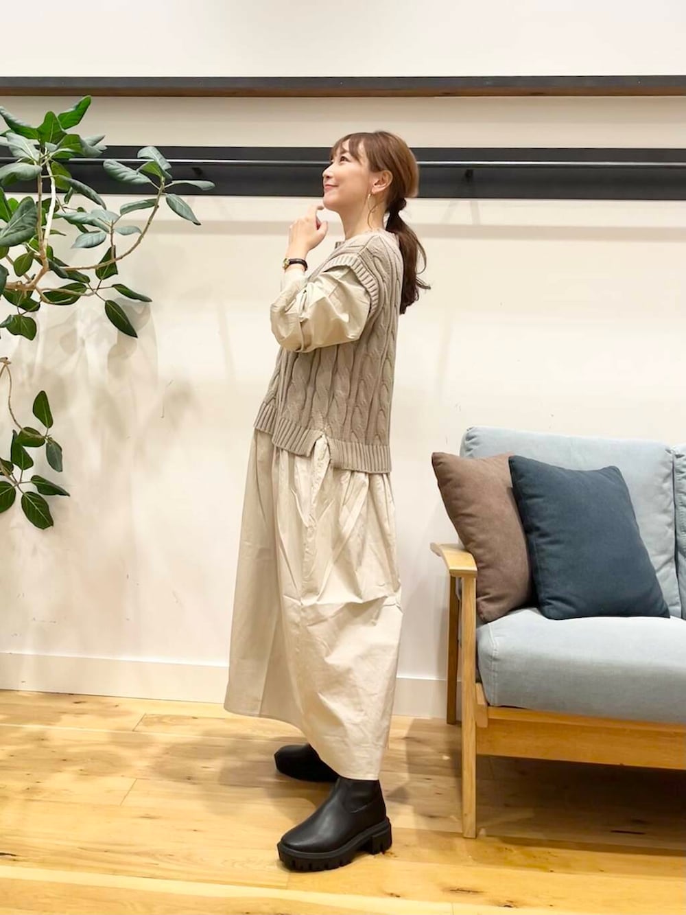今回は柔らかい印象になるグレージュを着ています。