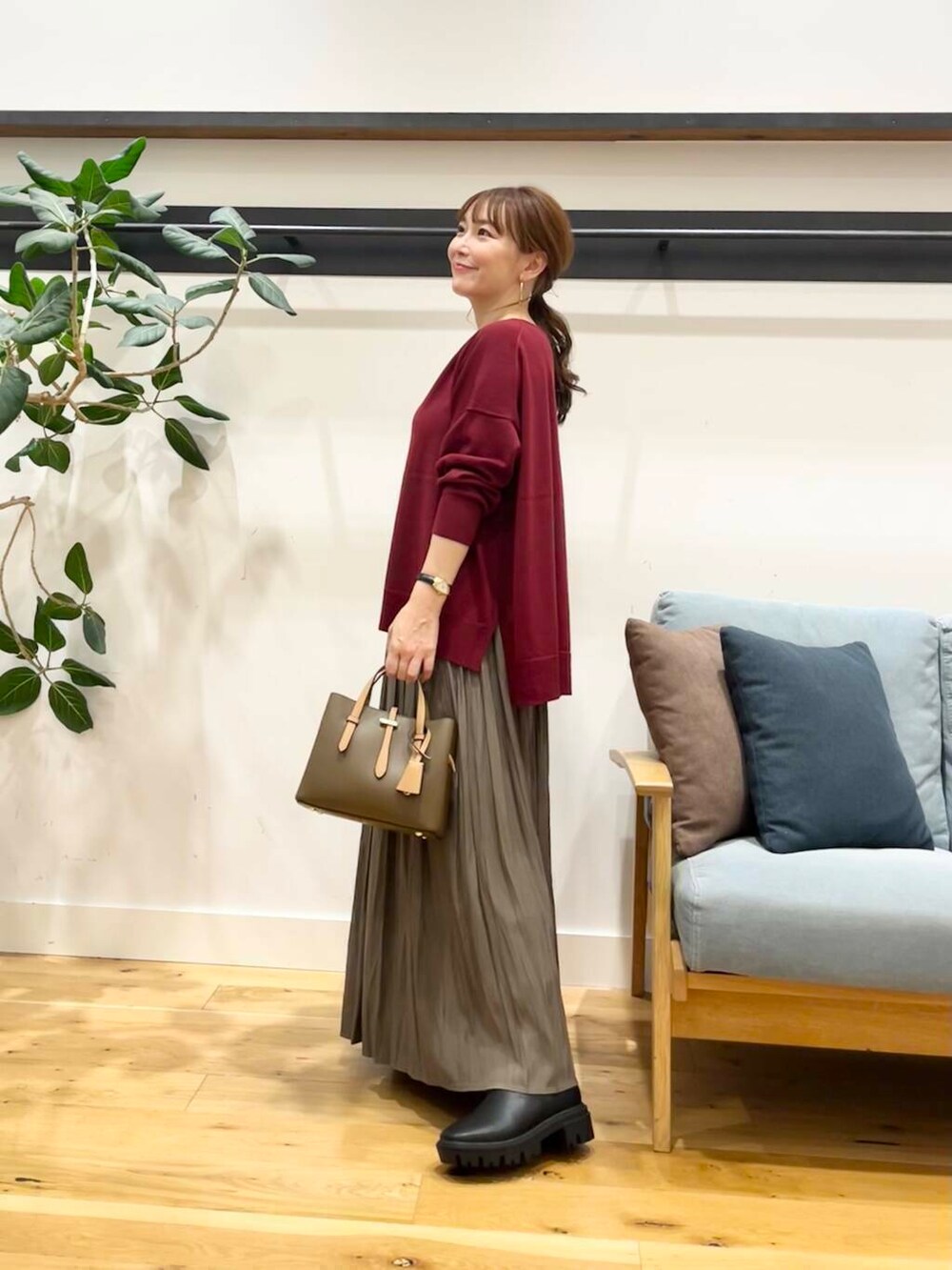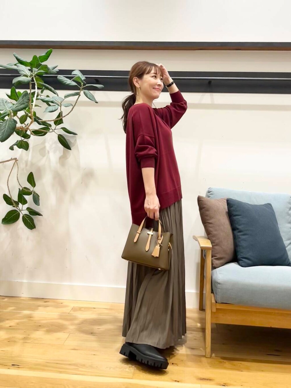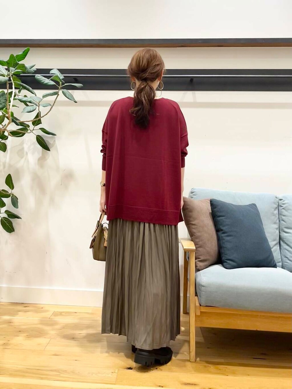 ランダムプリーツスカートを合わせてます。プリーツですが広がりすぎないのでゆったりしたトップスでも合わせやすいスカート。