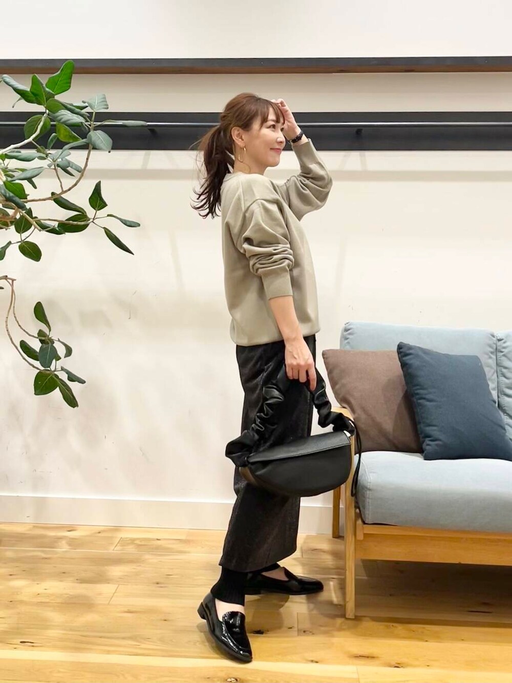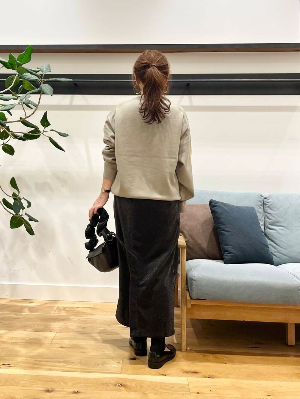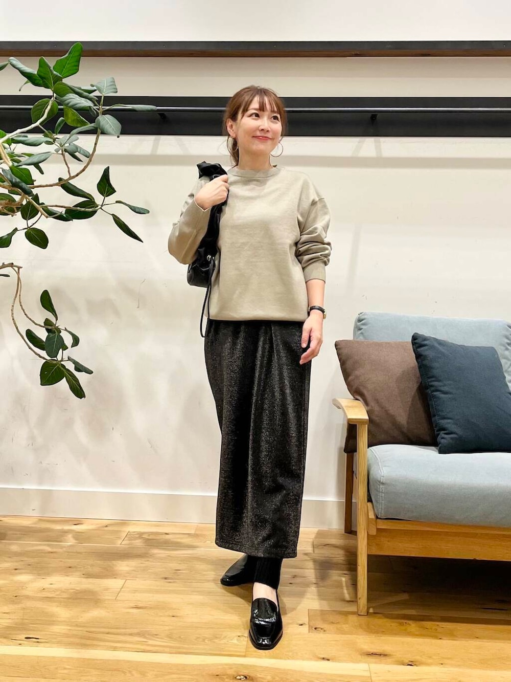 合わせてるのは履き心地楽々なラメカットストレートスカート。
