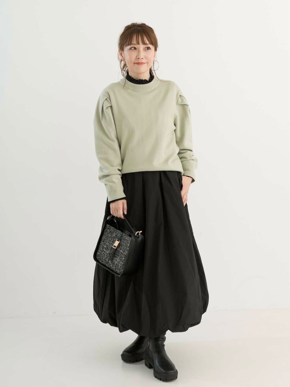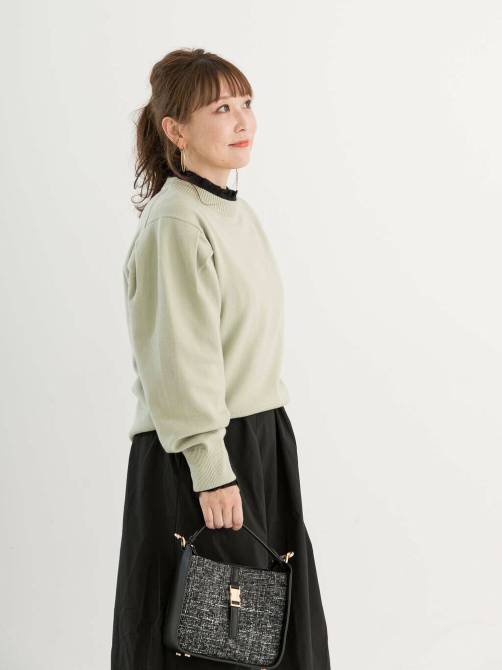 普通のニットって掛けてたり着てるうちに伸びてしまうこともあるので脱ぎ着する時気を使うんですが、目が細かくちゃんと詰まったニットなので気を使わずにほんとにスウェット感覚で気軽に着れました♪中に合わせてるのはピンタックフリルスタンドカラーブラウス。
