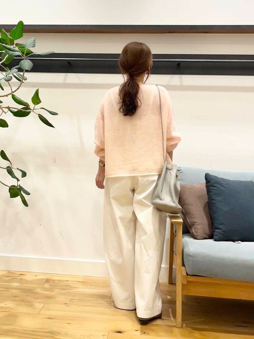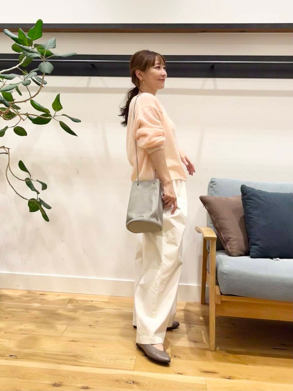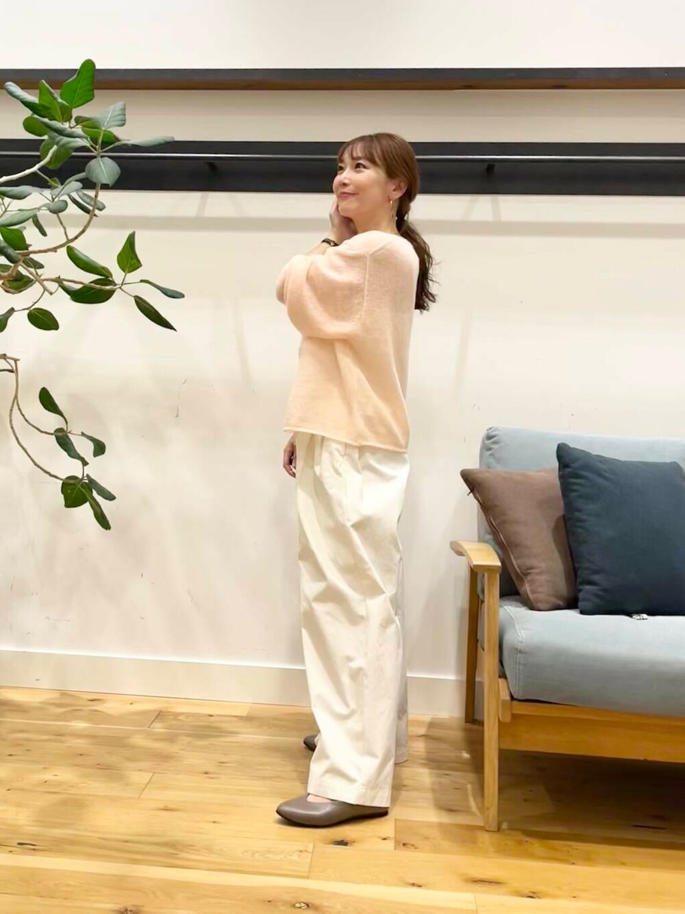今回はコットン2タックワイドパンツを合わせました。 大人気のコットンクロップドパンツと生地感似てるんですがこちらの方がちょっと長く、裾までワイドシルエット。 私は長いのでウエストひとつ折って履いてます。(151㎝) タックがしっかり入ってるのでお腹周りもかなりゆとり出るので短めトップスとの相性も良し、楽ちんな履き心地です◎(^^)