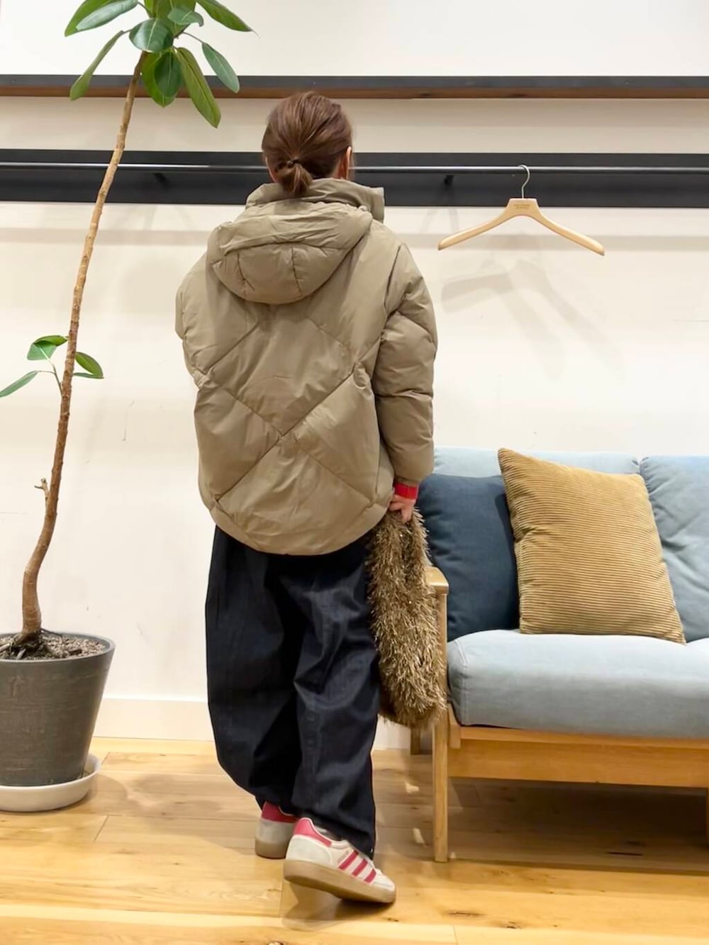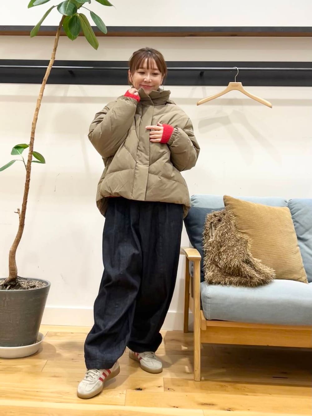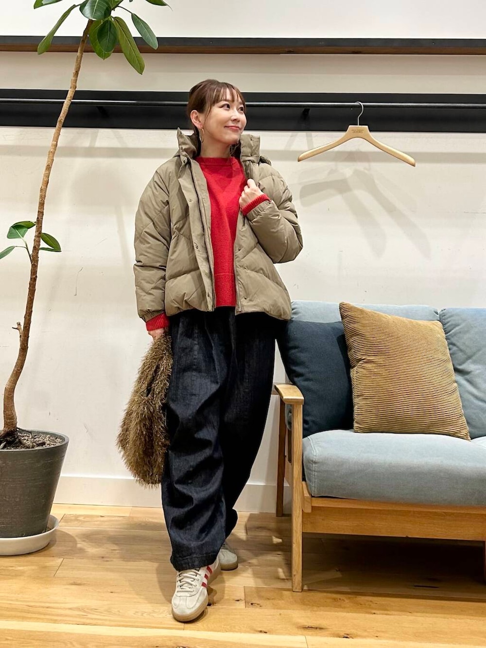 ボトムスにかぐれのデニムボリュームパンツを合わせてます。